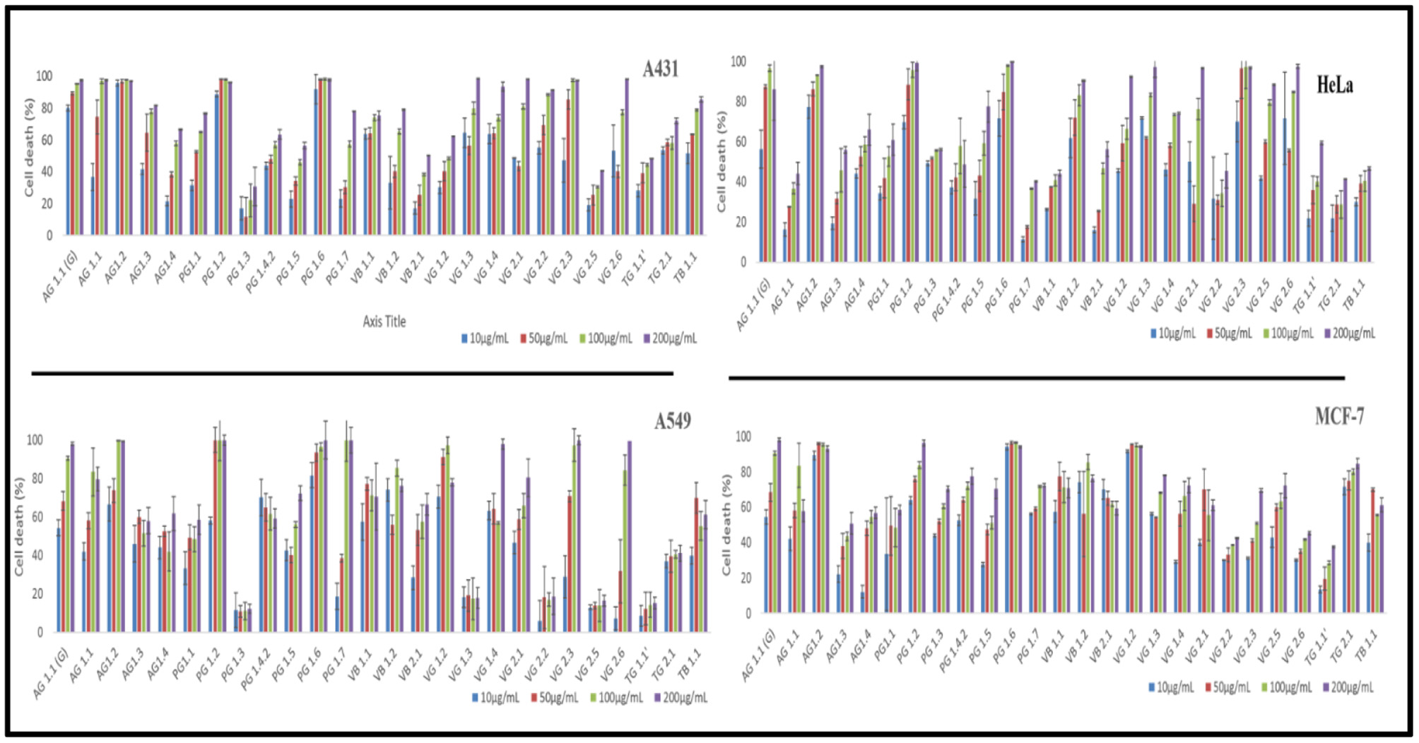 Figure 4. In vitro cytotoxicity of ethyl acetate total culture fungal extracts against A431, HeLa, A549 and MCF-7 cells. Cells were incubated with different concentrations (25, 50, 100, and 200 μg/mL) of extracts and the cytotoxicity was determined by MTT assay.