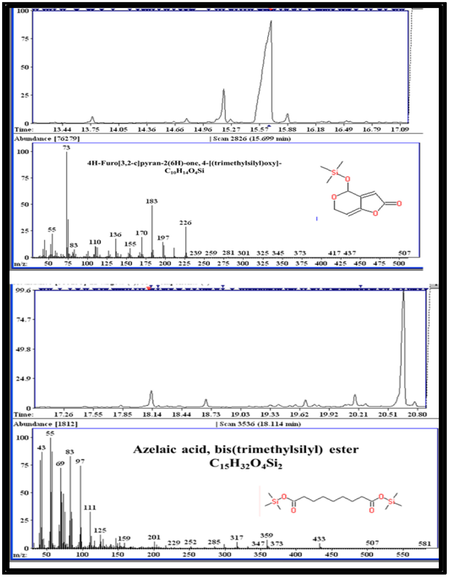 Figure 5. Representative compounds found by GC-MS analysis in ethyl acetate extract of AG 1.2 (Aspergillus unguis).