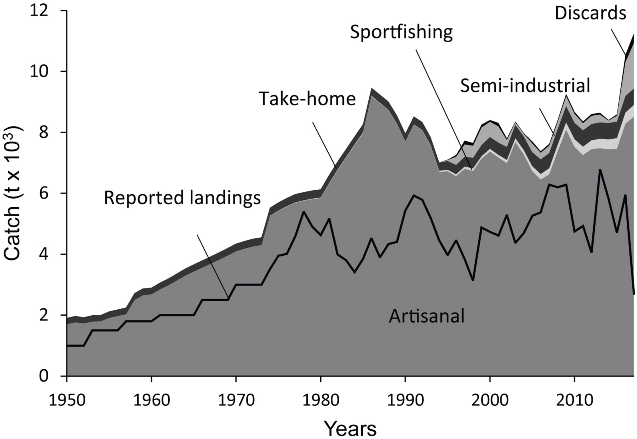 The taxonomic composition for the estimated sportfishing catches was based on the reported sportfishing landings from 1990 (SFA, 1991) and anecdotal4 reports of targeted reef fish (FAO, 2005; Martín, 2011; Breuil and Grima, 2014; Nageon et al., 2014; Pepperell et al., 2017). This disaggregation was held constant for the entire period this fishery was active, i.e., 1971–2017 (SFA, 1988, 1991). See Supplementary Tables S4 for details.