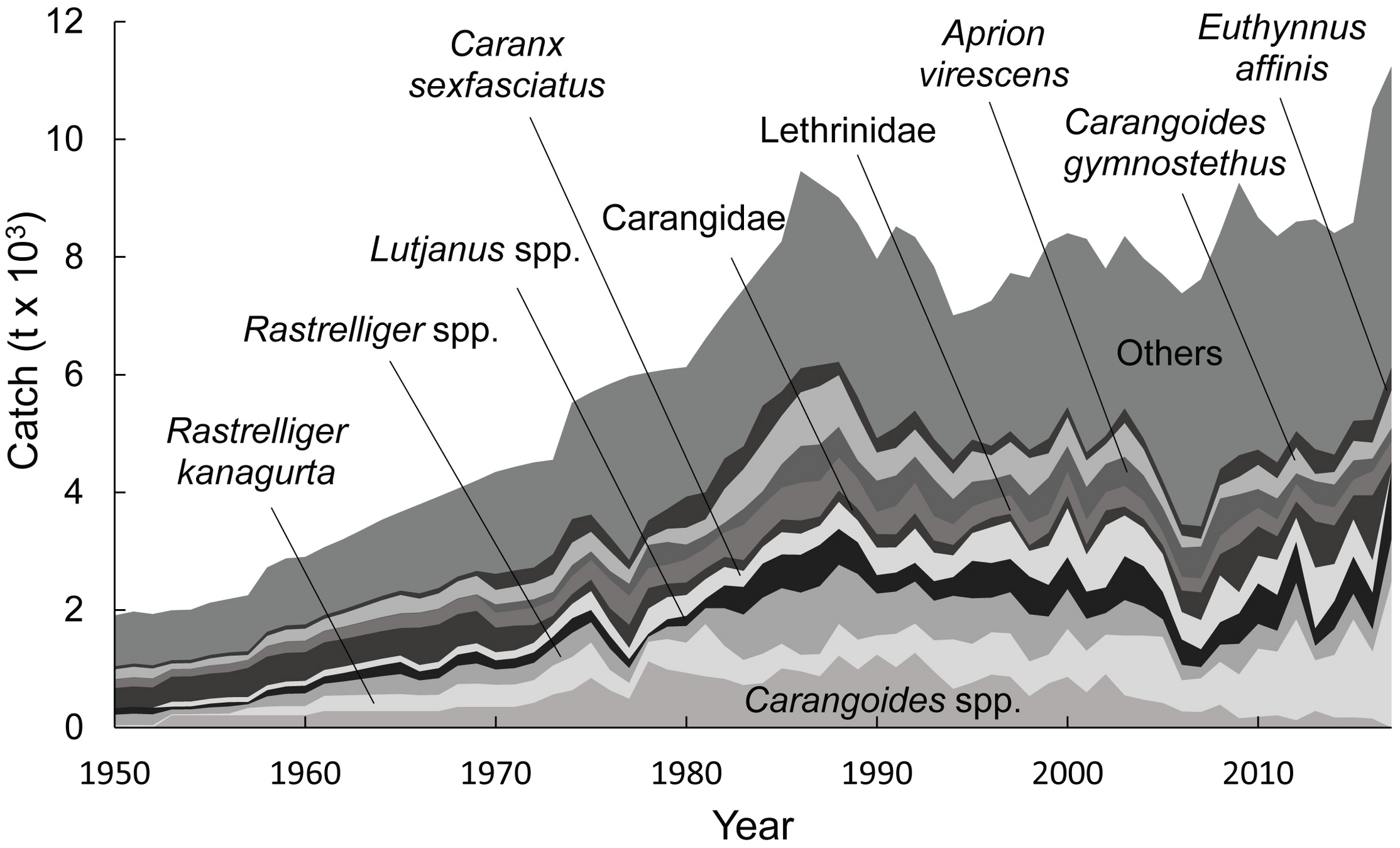 Taxonomic composition of reconstructed total catches for Seychelles for 1950–2017. The category “Others” consists of 82 additional taxa with minor contributions to the overall catch.