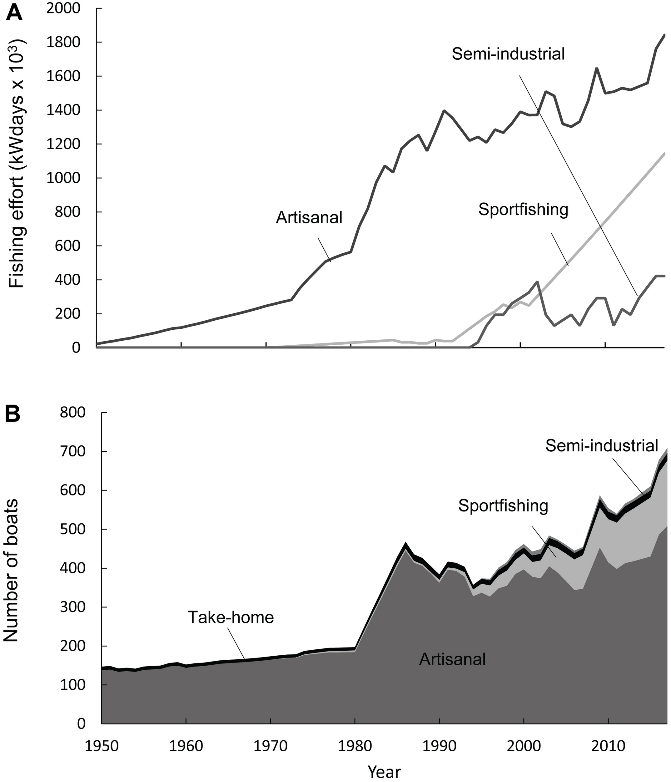 The total effective fishing effort, here estimated as annual fishing capacity, has grown from 21,500 kWdays in 1950 to over 3.4 million kWdays in 2017 (Figure 4A). In addition to the gradual increase in the total number of vessels, from 147 vessels in 1950 to 708 vessels in 2017 (Figure 4B), effective fishing effort has also increased due to the introduction and growth in vessel motorization. Artisanal (and take-home component) fishing effort represented 100% of the total effective effort in 1950 but declined to 53% in 2017 (Figure 4A). This percent decline was primarily due to the establishment and rapid growth of the sportfishing sector and more recently the semi-industrial sector. The sportfishing sector began in 1971 with an estimated 2,800 kWdays of effort and grew to over 1.1 million kWdays in 2017 (Figure 4A). The semi-industrial sector began in 1995 and by 2017 accounted for 12% of the total effort (Figure 4A).