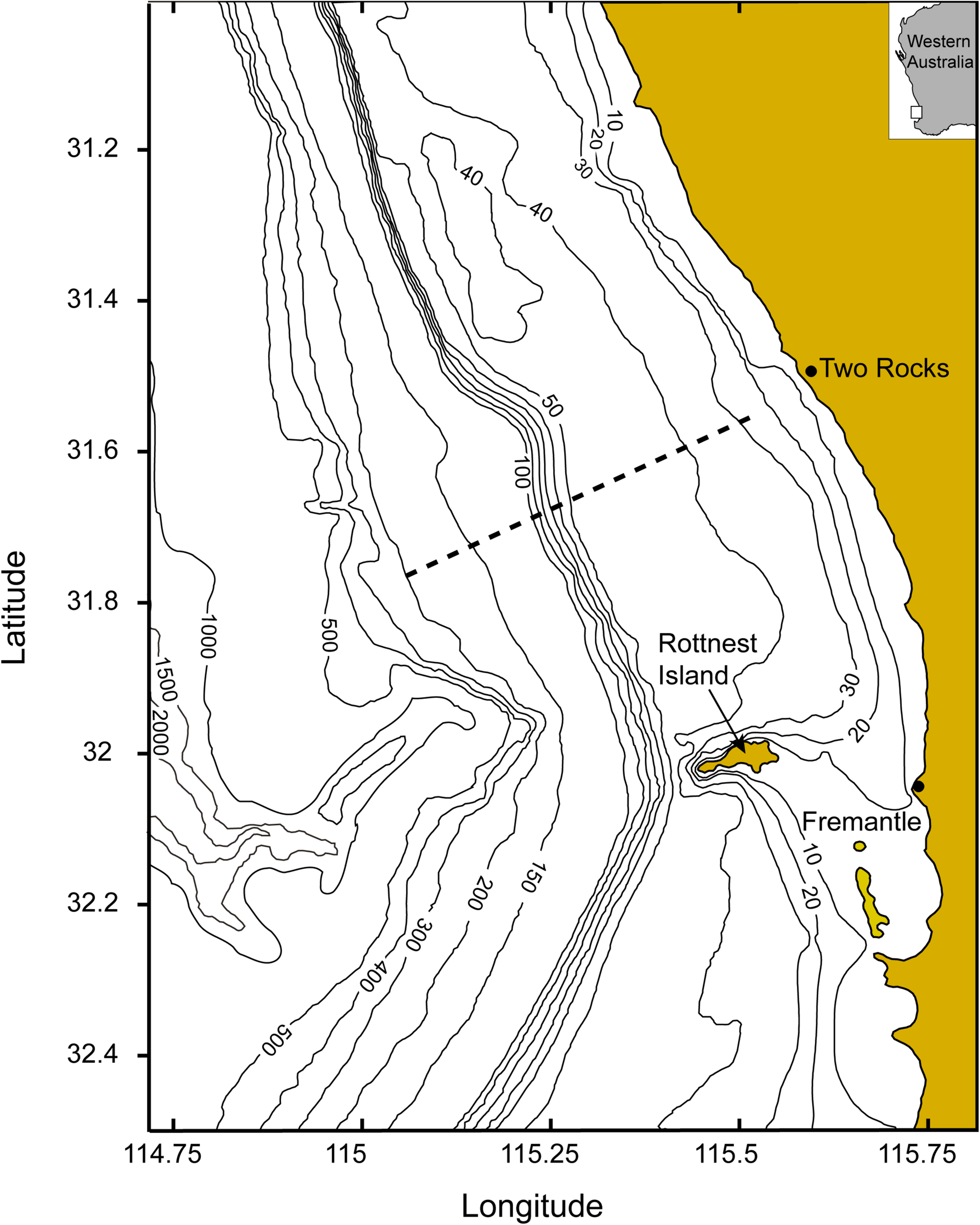 Two major physical processes influence the water column of the Rottnest continental shelf: (1) DSWC - dense shelf water cascades during autumn and winter months (Pattiaratchi et al., 2011; Mahjabin et al., 2019a, b); and, (2) strong sea breezes during the summer months that result in a well mixed water column in water depths < 50 m. Sporadic upwelling may also occurs during the summer months (Gersbach et al., 1999; Hanson et al., 2005; Rossi et al., 2013).