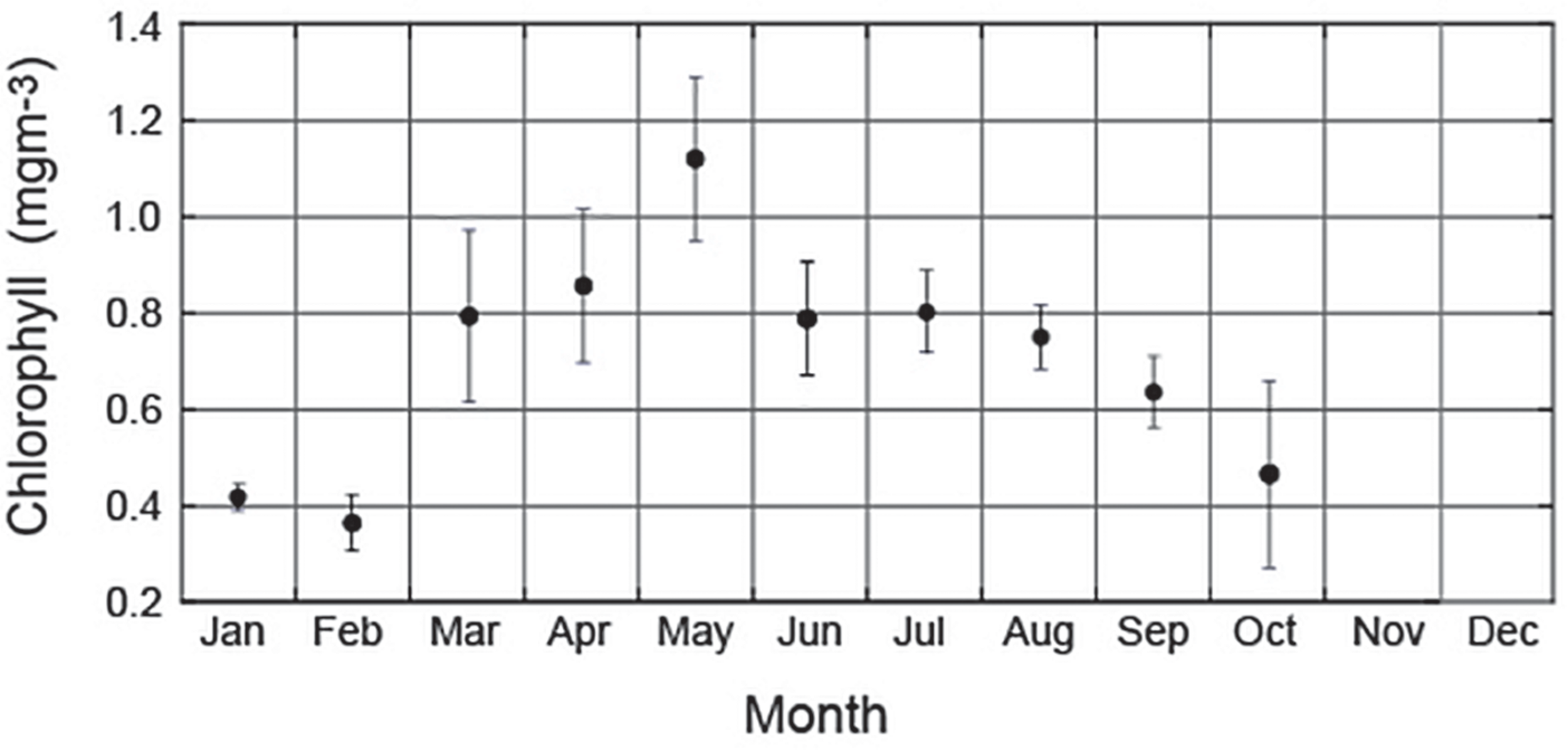 Time series of monthly mean chlorophyll concentration along the Rottnest continental shelf derived using ocean glider data. Vertical bars represent standard deviation. Note that there were insufficient data for November and December.
