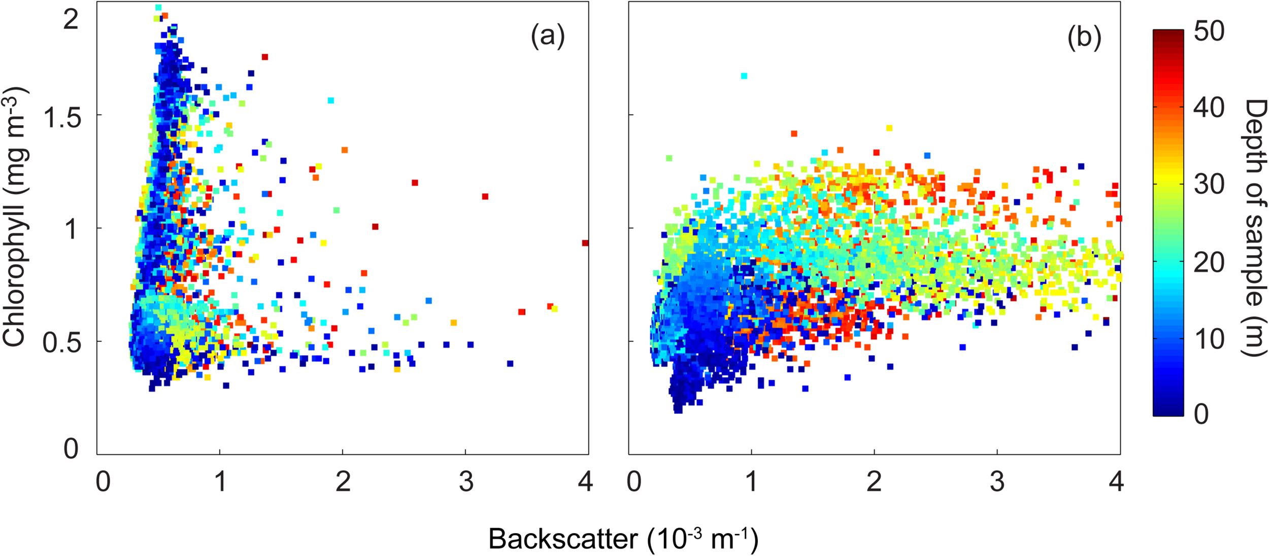 Backscatter (m–1) and chlorophyll (mg m–3) scatter plot. (a) 19–21 May 2009; and (b) 23–25 May 2009.