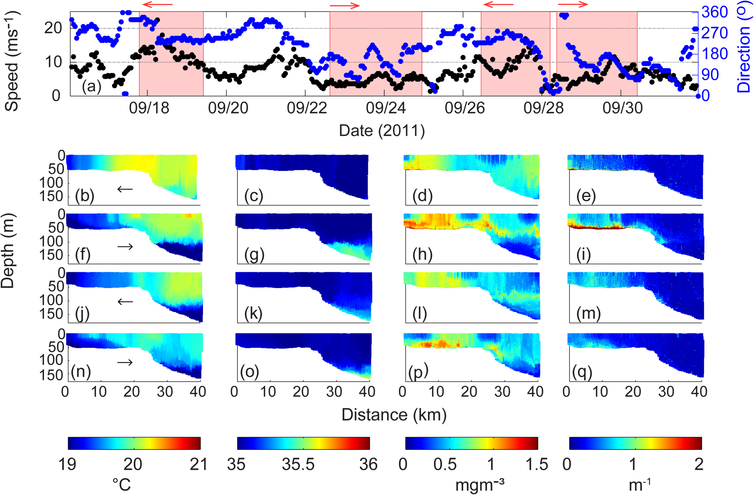 (a) Wind speed and direction at Rottnest Island during 17–30 September 2011. The shaded areas represent the period of ocean glider transect; Ocean glider vertical cross-sections of (b) temperature (°C); (c) salinity; (d) chlorophyll (mg m–3); and (e) backscatter (m–1) across the Rottnest continental shelf during 17–19 September 2011; (f–i) water properties during 23–25 September 2011; (j–m) water properties during 27–28 September 2011; and (n–q) water properties during 28–30 September 2011. The direction of the glider path is indicated by the arrow.