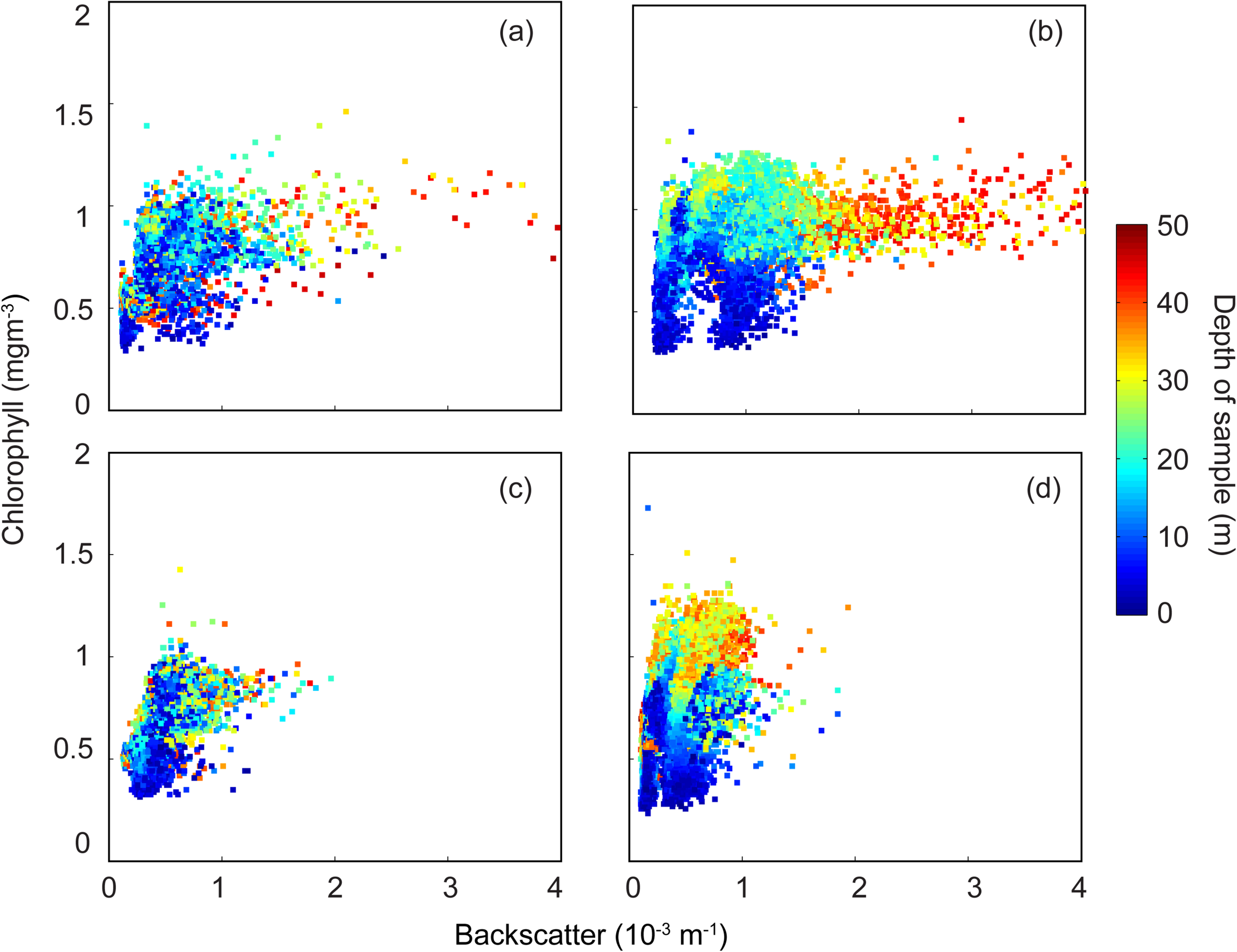Backscatter (m–1) and chlorophyll (mg m–3) scatter plot. (a) 17–19 September 2011; (b) 23–25 September 2011; (c) 27–28 September 2011; and, (d) 28–30 September 2011.