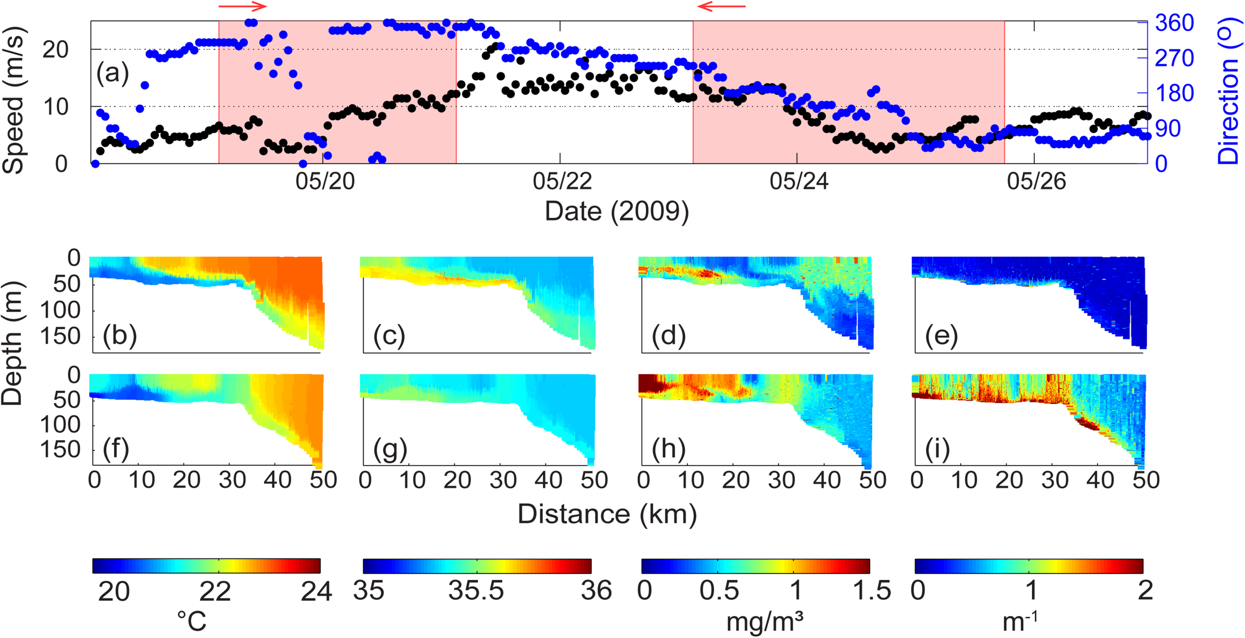 (a) Wind velocity and direction at Rottnest Island during 19–25 May 2009. The shaded areas represent the period of ocean glider transect; Ocean glider vertical cross-sections of (b) temperature (°C); (c) salinity; (d) chlorophyll (mg m–3); and, (e) backscatter (m–1) across the Rottnest continental shelf during 19–21 May 2009; (f–i) water properties during 23–25 May 2009. The glider flight direction is indicated by the arrow.