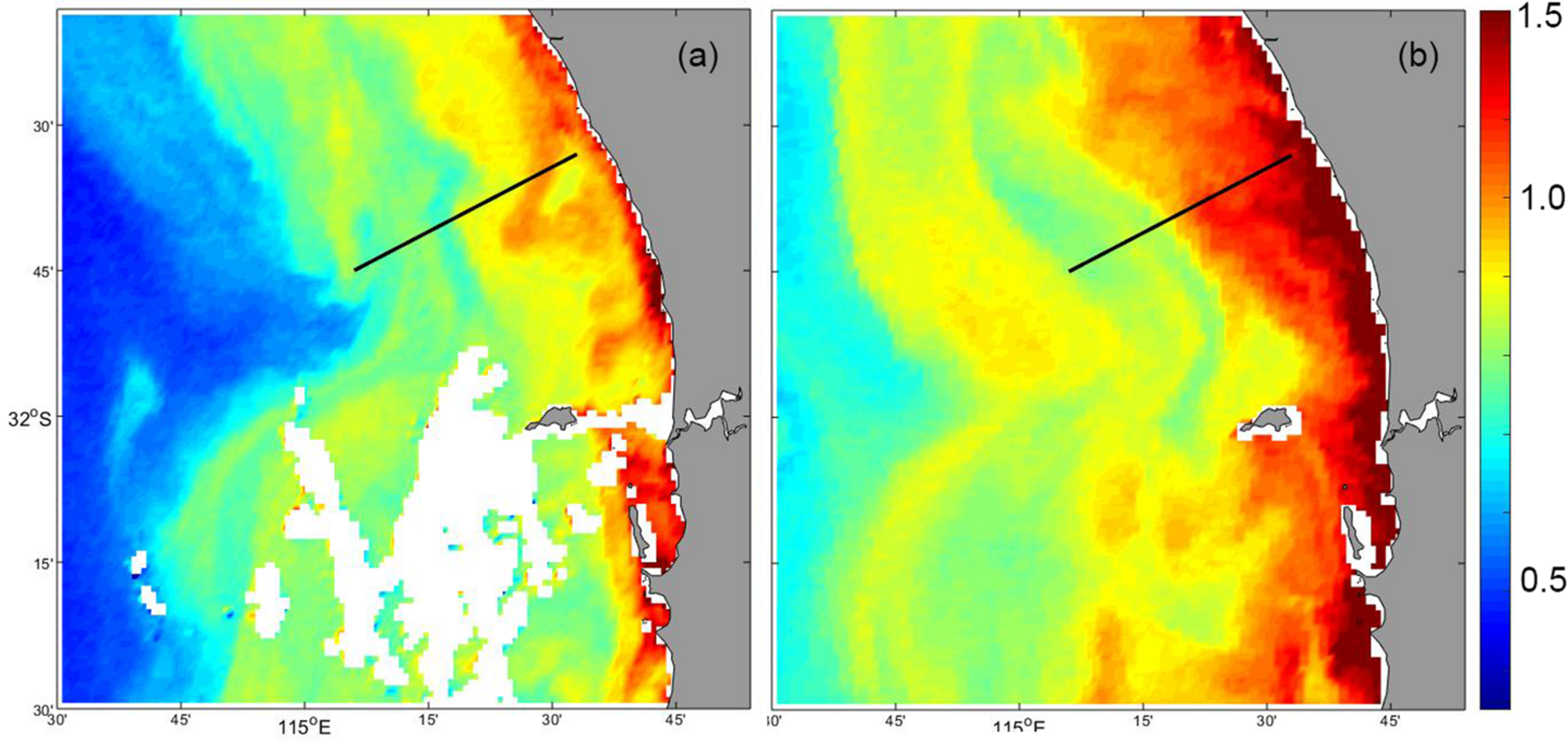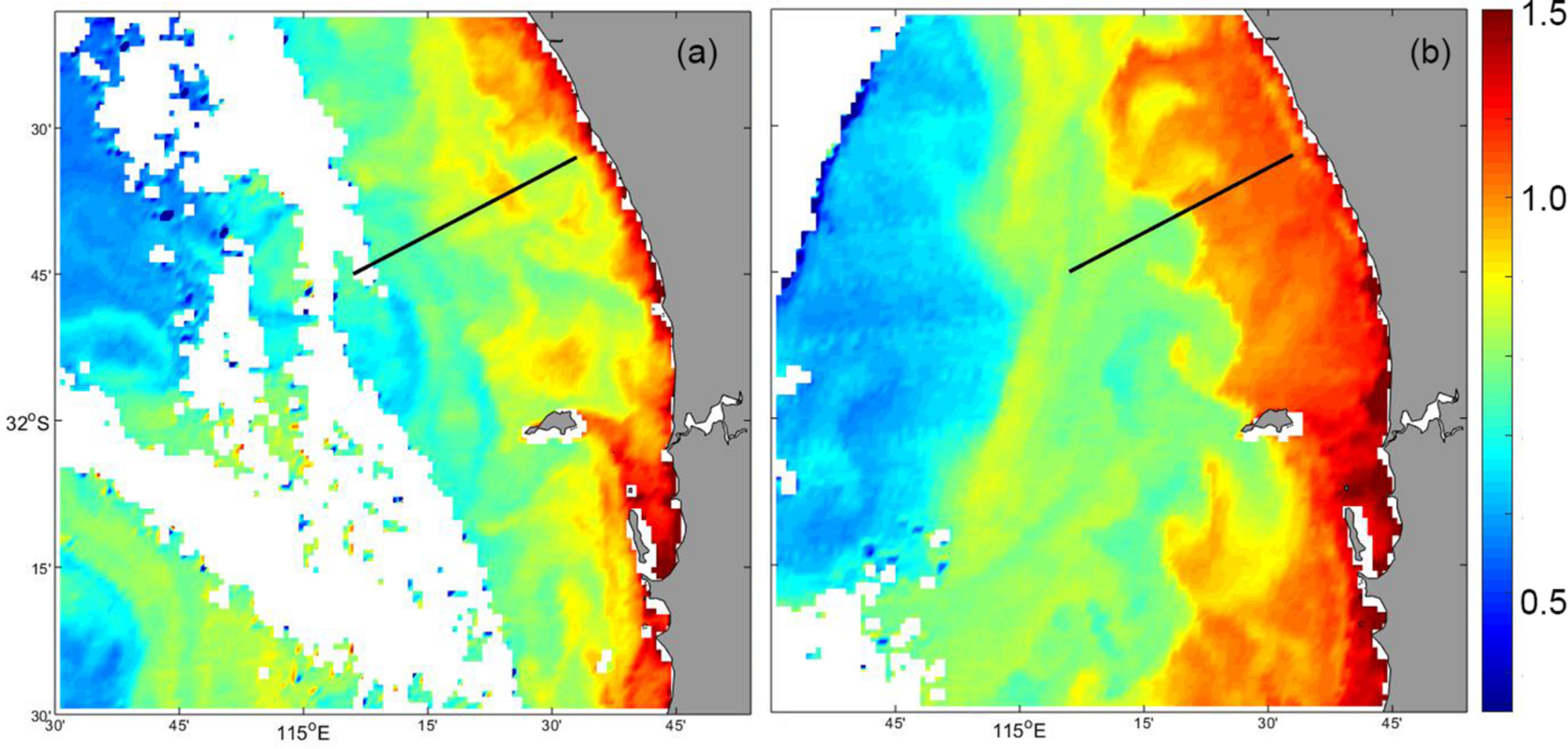 MODIS satellite derived surface chlorophyll concentration: (a) 18 May 2009; and (b) 29 May 2009. The glider transect is shown as the dotted line.