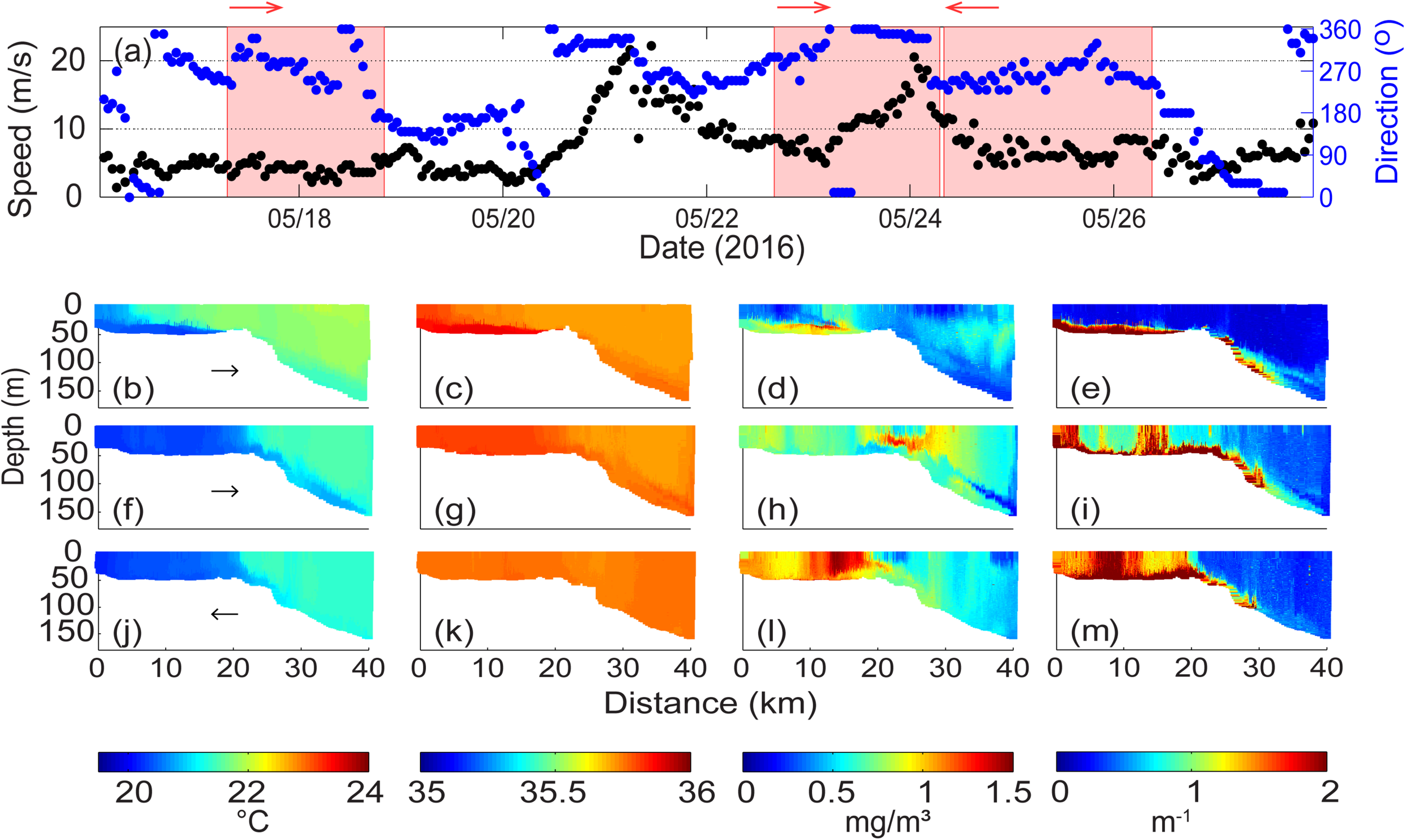(a) Wind velocity and direction at Rottnest Island during 17–26 May 2016. The shaded areas represent the period of ocean glider transect; Ocean glider vertical cross-sections of (b) temperature (°C); (c) salinity; (d) chlorophyll (mgm–3); and (e) backscatter (m–1) across the Rottnest continental shelf during 17–18 May 2016; (f–i) water properties during 22–24 May 2016; and (j–m) water properties during 24–26 May 2016. The glider flight direction is indicated by the arrow.