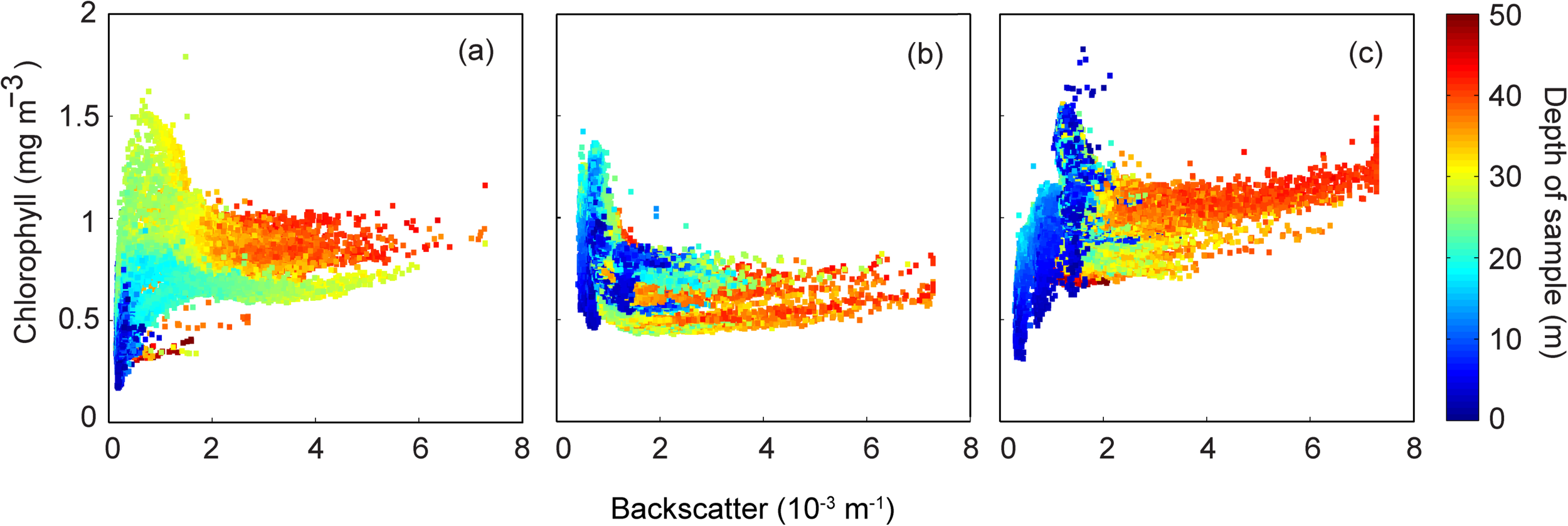 The backscatter/chlorophyll diagram reflected the influence of the storms in the chlorophyll concentrations at different depth levels. At the low wind period before the storms the surface chlorophyll concentrations were low with higher levels in the depth ranging between 20 and 30 m (Figure 11a). In deeper waters (>40 m) the chlorophyll concentrations had a mean ∼1.0 mgm–3. Subsequent to the storm the chlorophyll concentrations decreased in the deeper waters but increased in the surface waters (Figure 11b). Subsequent to the second storm depth based chlorophyll stratification re-appeared. Here, the surface and deeper water (>40 m) chlorophyll concentrations increased (Figure 11c).