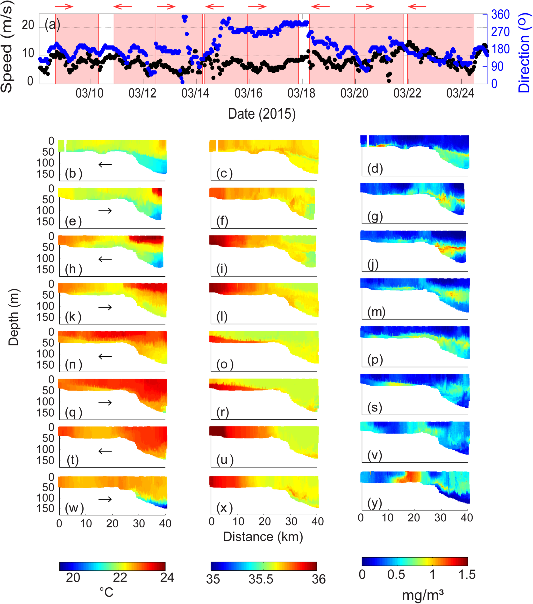 (a) Wind velocity and direction at Rottnest Island during 8–24 March 2015. The shaded areas represent the period of ocean glider transect; Ocean glider vertical cross-sections of (b) temperature (°C); (c) salinity; and (d) chlorophyll (mg m–3) across the Rottnest continental shelf during 8–10 March 2015; (e–g) water properties during 10–12 March 2015; (h–j) water properties during 12–14 March 2015; (k–m) water properties during 14–15 March 2015; (n–p) water properties during 15–18 March 2015; (p–s) water properties during 18–19 March 2015; (t–v) water properties during 19–21 March 2015; and (w–y) water properties during 21–24 March 2015. The glider flight direction is indicated by the arrow.