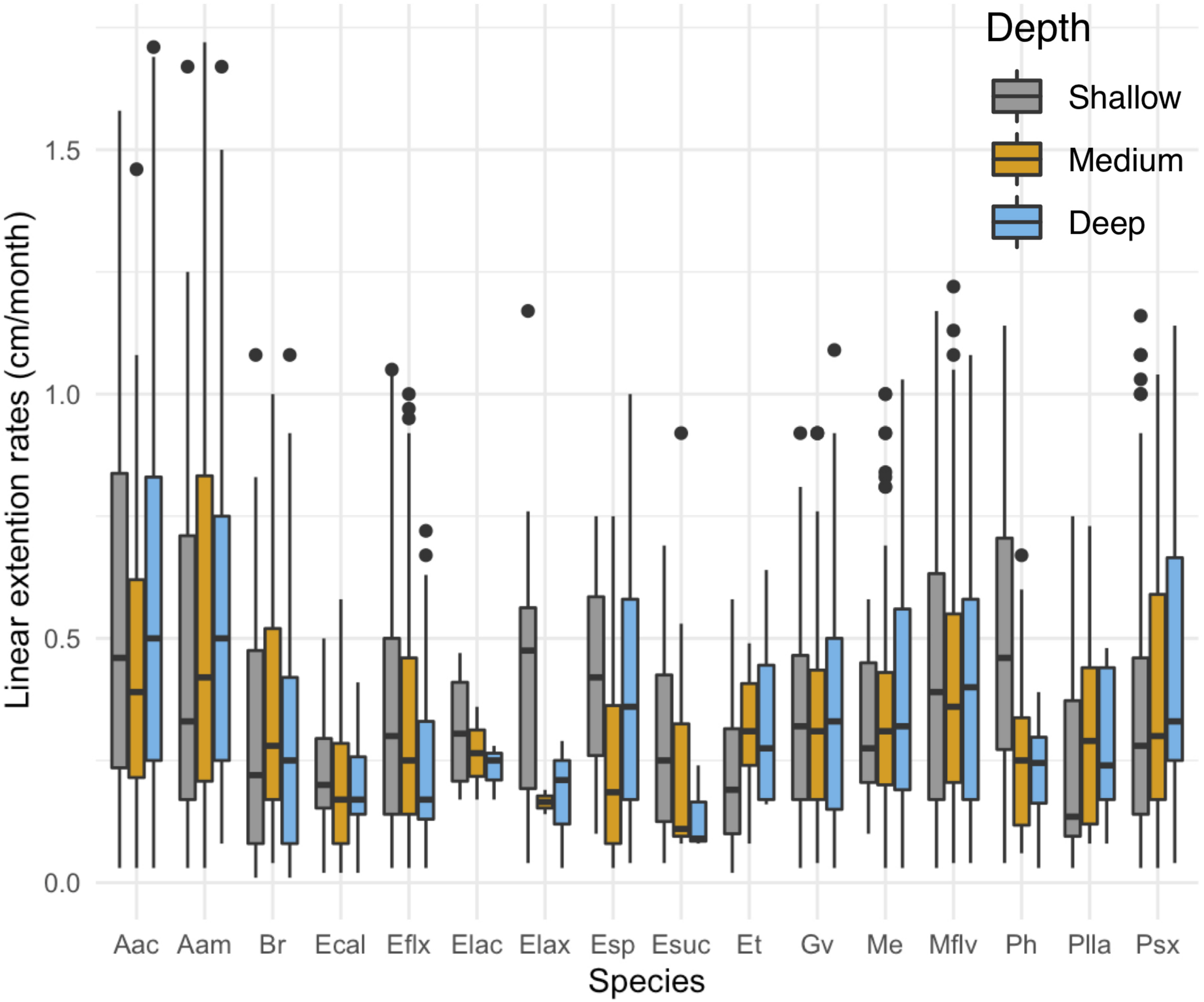 Differences in mean growth rate (cm/month) across depths per species. Boxplots shows median values and upper (75) and lower (25) quantiles.