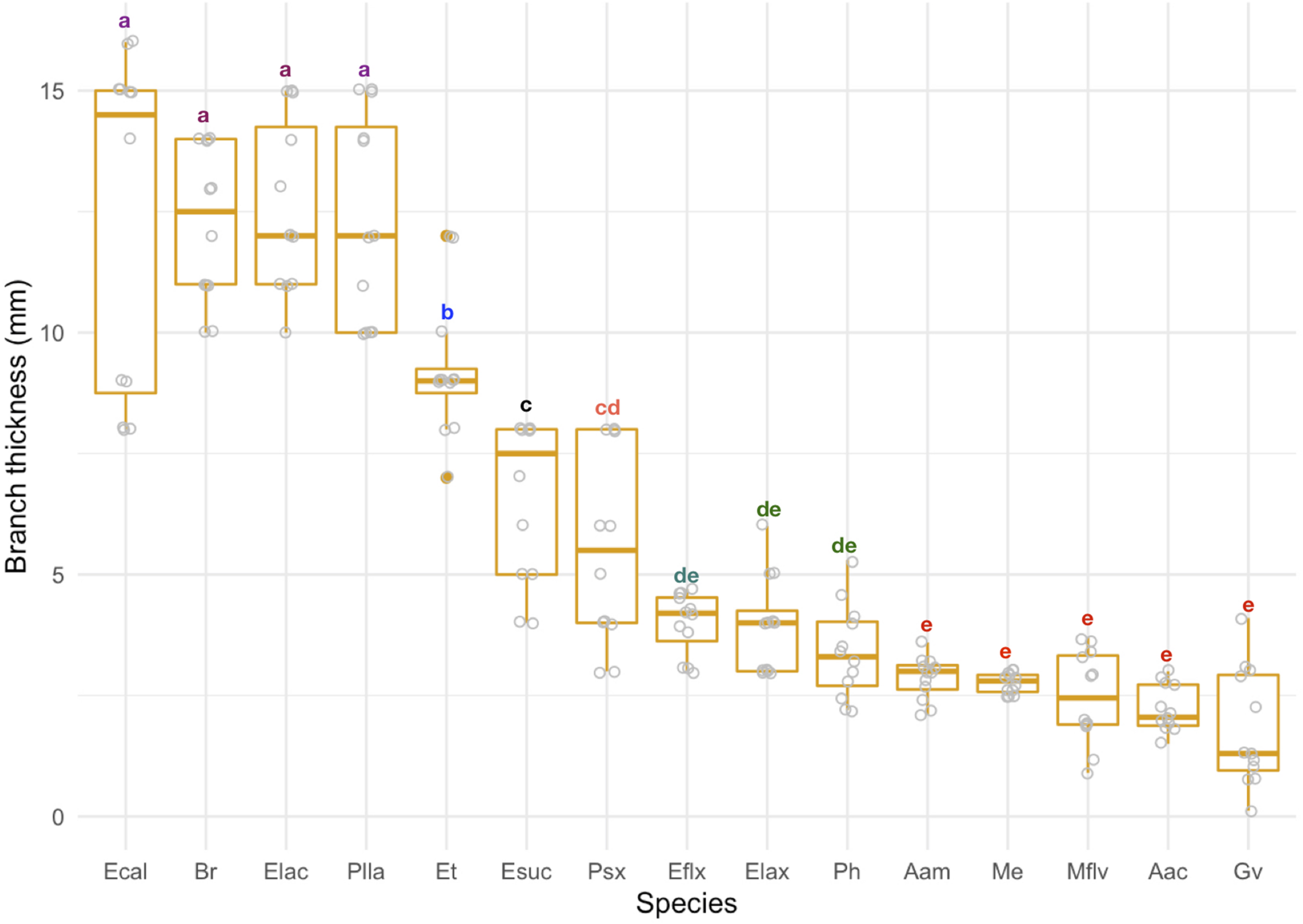 Branch thickness (mm) across species. Colonies are ordered according to their mean value. Error bars represent standard deviation. Letters indicate significant differences among groups.