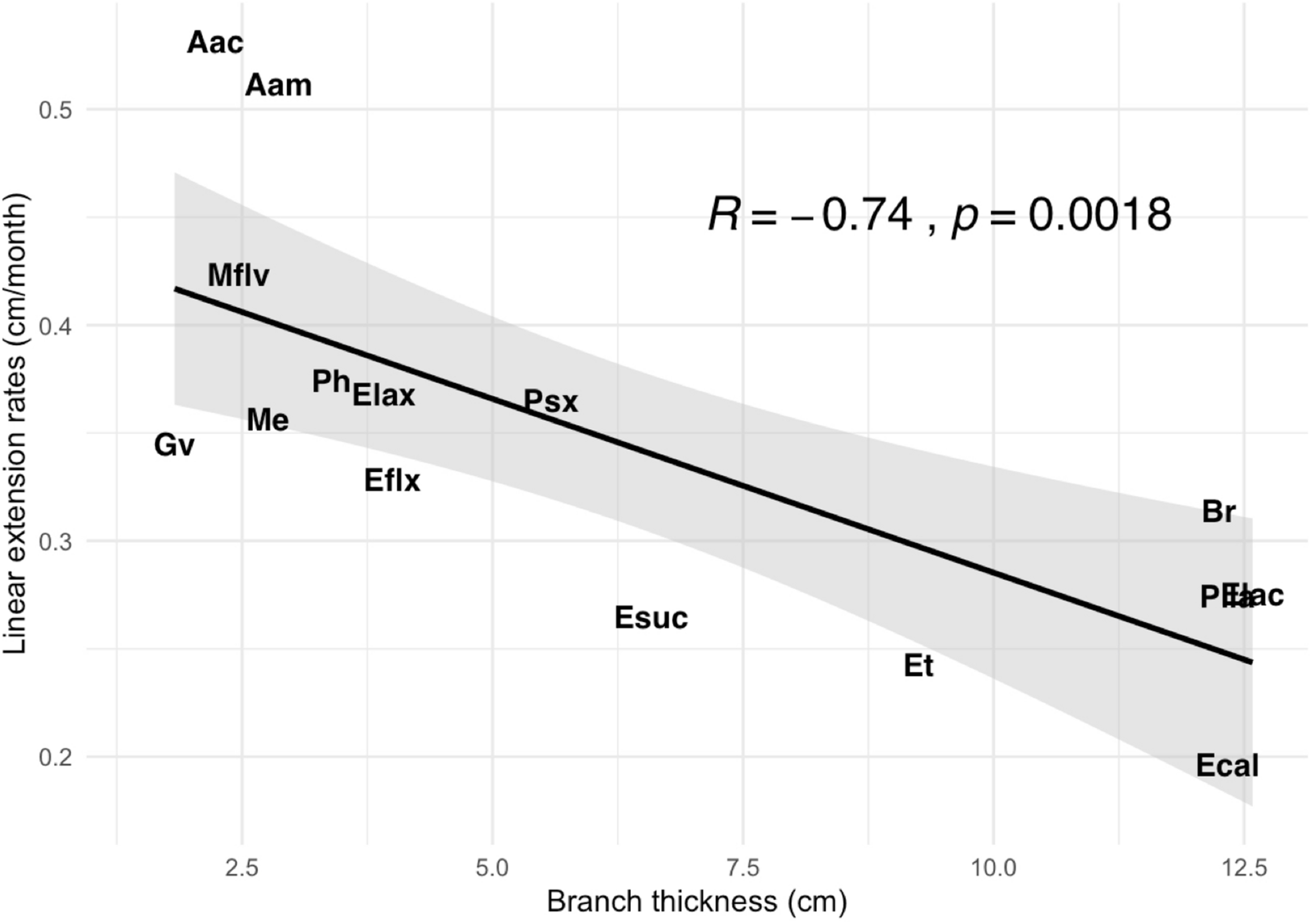 Variation in Linear Extension Rates Across Species With Different Branch Thickness