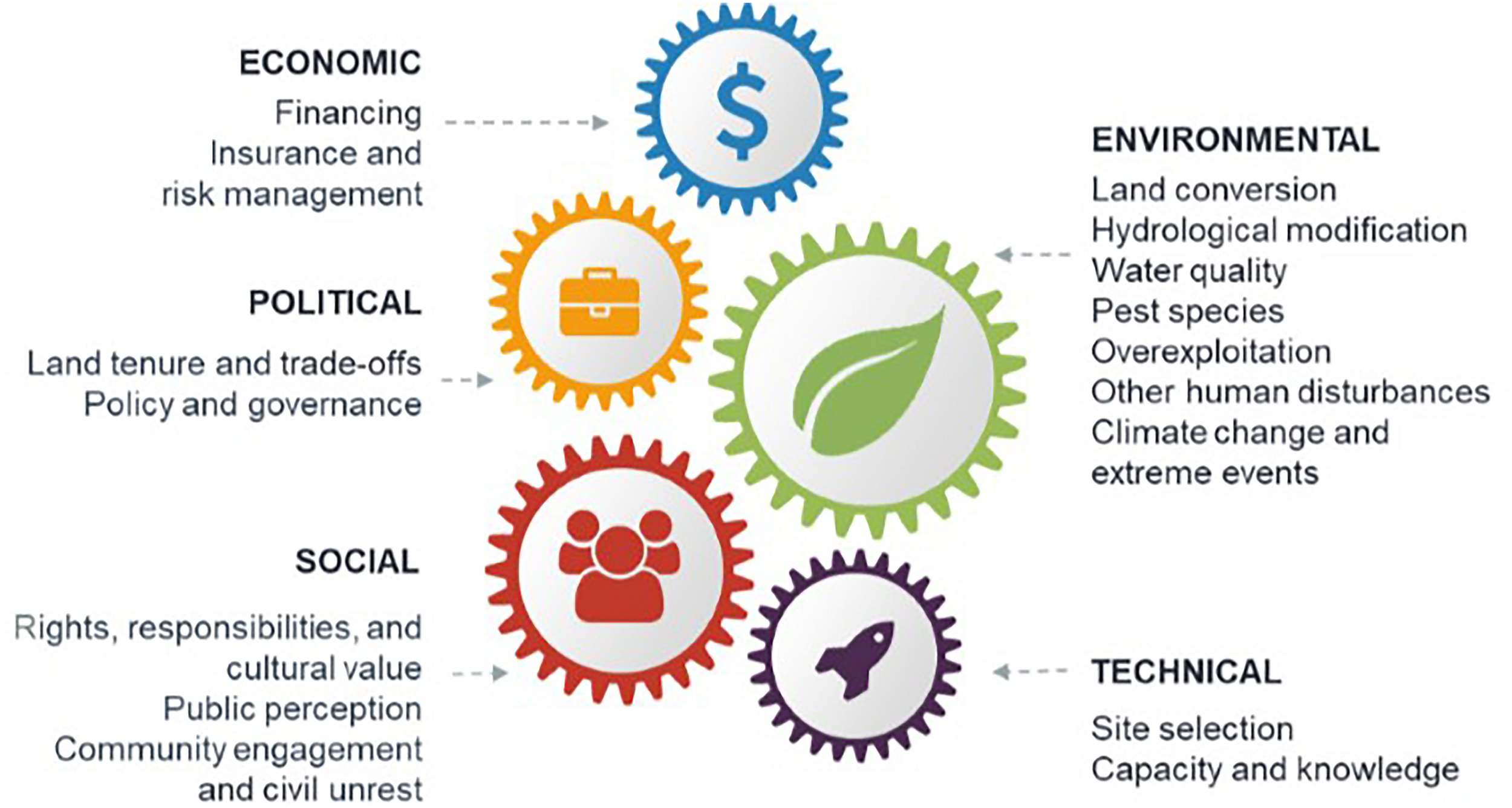 A series of workshop discussions among the authors drew on our knowledge of the restoration literature to identify common barriers to successful blue restoration at the scale required to meet future targets (MEA, 2005; CBD, 2010; Salvador, 2018; GMA, 2019). We categorized these into five broad classes: environmental, technical, social, economic, and political (Figure 1). To supplement the knowledge of the authors, we conducted a targeted search of the Web of Science databases and Google Scholar. The resulting literature (WebTable 1) was used to (1) describe how environmental, technical, social, economic, and political barriers can hinder success of blue restoration projects, and (2) give solutions to these barriers based on our literature search (Table 1). We further illustrate these solutions utilizing case studies including: