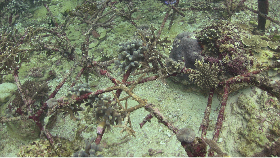 Context and solution: The project deployed small, modular, open structures (‘spiders’) to stabilize rubble and to support transplanted coral fragments over 2 years. The structures allowed unrestricted water flow, trapped broken coral fragments and rubble, and stabilized the substratum to support coral recruitment, growth, and diversity. Live coral cover on the structures increased from less than 10% to greater than 60%, although this varied depending on depth, deployment date, location, and disturbances.