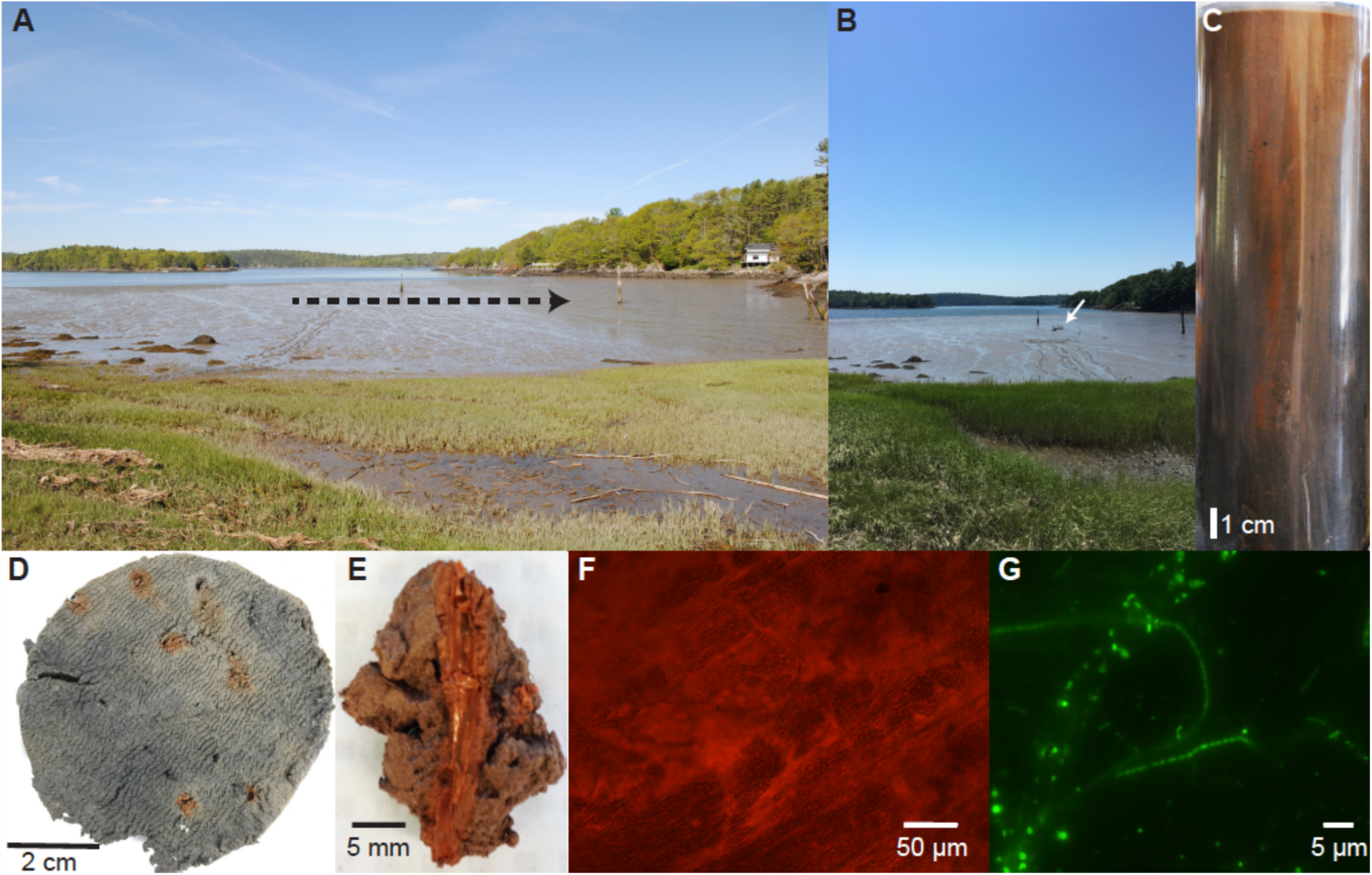 A photomontage of images over different time and spatial scales from seasonal sampling at “The Eddy” (Maine, United States; 43.994827, −69.648632). A landscape view of the mudflat at low tide (A; 26 May 2016) with dashed arrow line depicting the progression of sampling throughout the annual cycle (tracks created from sampling are visible at the position distal to the arrowhead). (B,C) A representative core (18 November 2015) taken from “The Eddy” at the site of the white arrow showing ∼20 cm of total sediment showing deep mixing by macrofauna up to ∼15–17 cm in depth by visible iron oxides, then the sediments become bluish-gray to black. A one-centimeter core slice from 5 cm depth (D) showing characteristic iron oxide lined worm burrows most likely created by the common polychaete Nereis diversicolor and/or the intertidal inhabiting hemichordate Saccoglossus kowalevskii. Close up image of a dissected iron oxide lined burrow (E; 28 December 2015) and light microscope image of burrow lining at 400x magnification (F). Fluorescence microscope image of DNA stained microorganisms inhabiting the iron oxide burrow lining (G; 8 October 2015). Filamentous Beggiatoa spp. (thick filament) And putative “cable bacteria” (thin filaments) were commonly observed throughout the year.