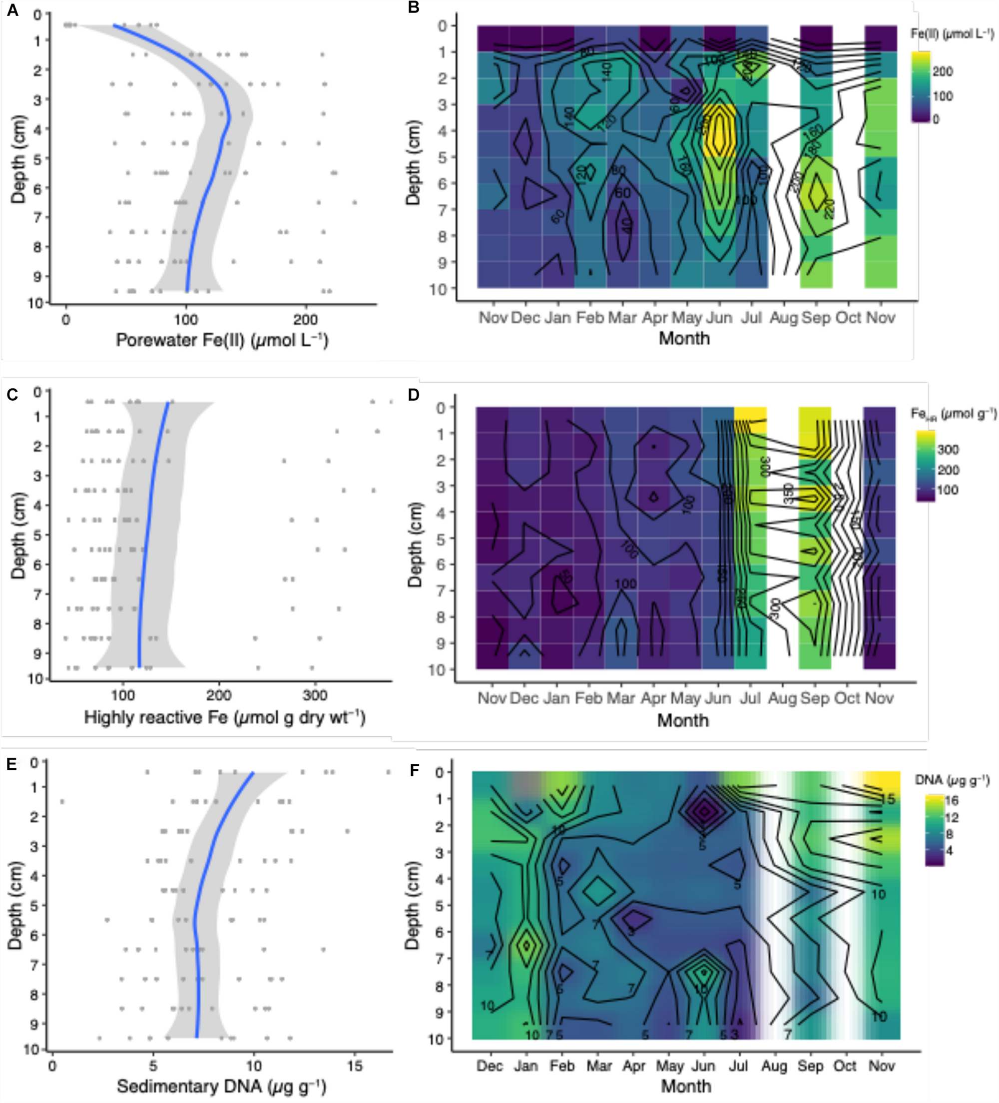 Porewater Fe(II), highly reactive Fe concentrations, and sedimentary DNA profiles from averages across depths and season (A,C,E) and over the annual seasonal cycle from Nov. 2015 to Nov. 2016 (B,D,F). Blue lines represent mean concentrations calculated from the individual seasonal data points (dark gray circles) and light gray shaded area is the 95% confidence interval.
