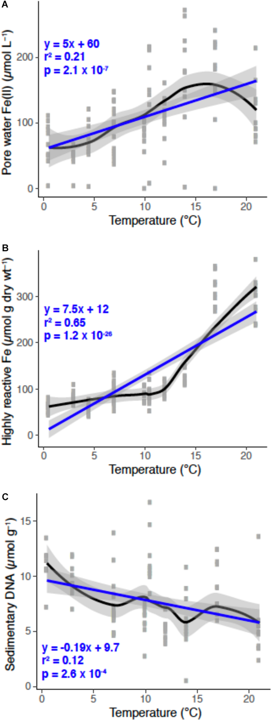 Porewater Fe(II; A), highly-reactive Fe (B), and sedimentary DNA (C) pools as a function of temperature over the annual cycle at “The Eddy.” Individual data points are gray for each sampling event over the year. Black and blue lines are a loess smooth and a generalized linear model fit, respectively, and gray shading represents the 95% confidence interval for each line fit. The linear model statistics and equation are in blue text.