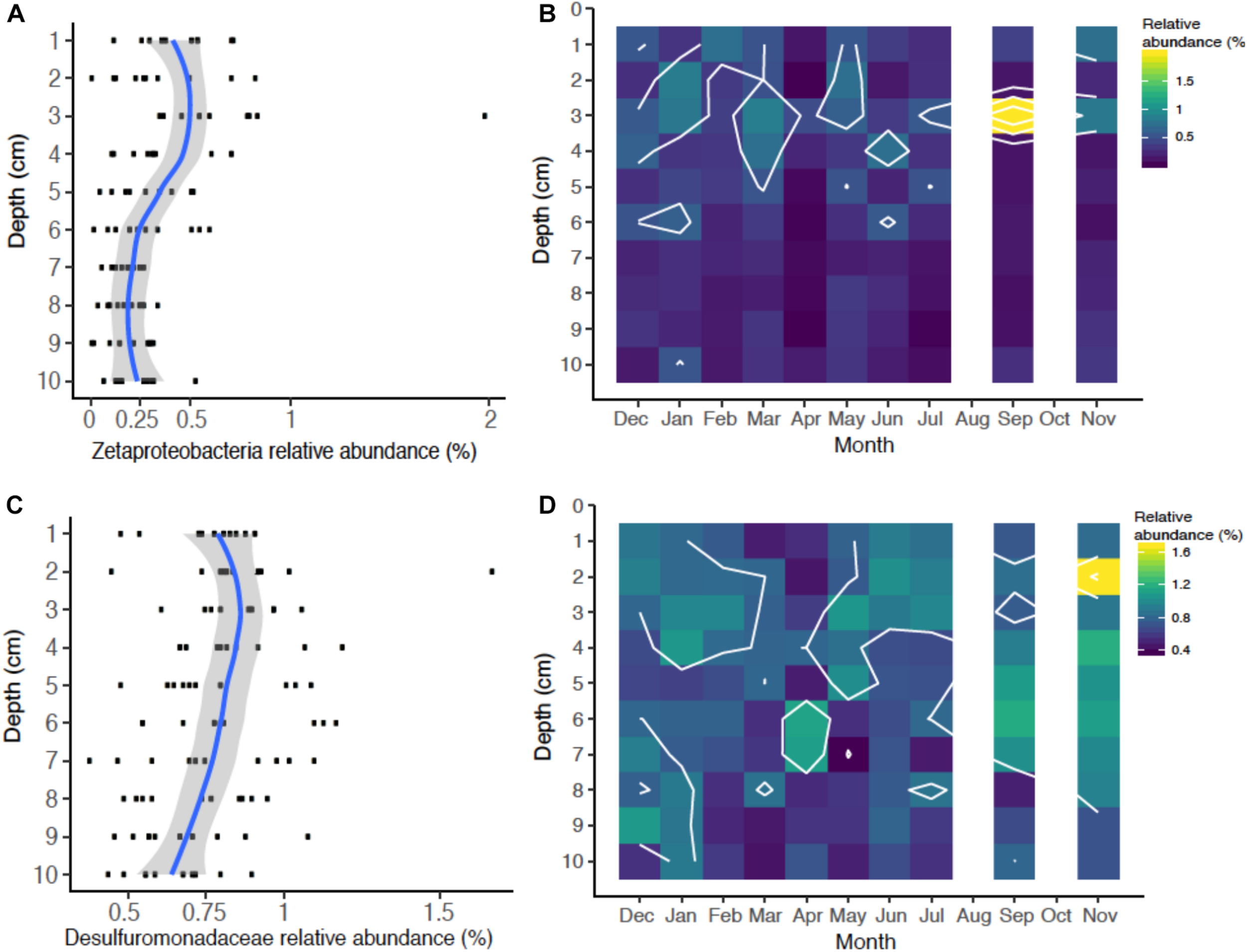 Relative abundance of iron cycling operational taxonomic units (OTUs) identified over the season: Iron-oxidizing Zetaproteobacteria (OTU00040) relative abundance as a function of depth (A) and season (B), and putative iron-reducing Desulfuromondaceae (OTU00028) as a function of depth (C) and season (D).