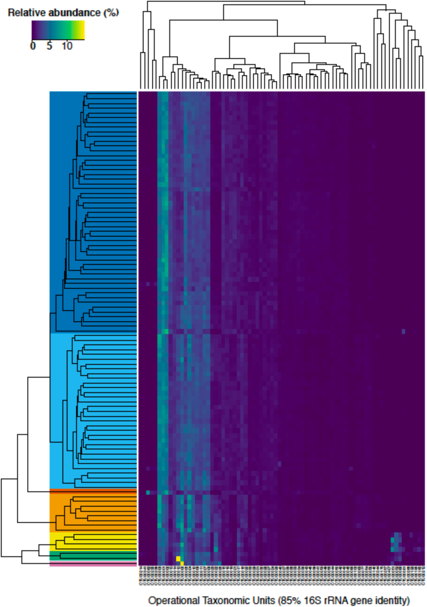 A heatmap of the relative abundance of bacterial and archaeal taxonomic units (OTUs) clustered at 85% identity that were at least 0.5% relative abundance in one sample (n = 76 OTUs). The different samples were clustered using average linkage hierarchical clustering of the Bray-Curtis dissimilarity as implemented in the R package vegan (Oksanen et al., 2019). Solid colors depict the different ecostates that were selected from the clustering analysis (see legend in Figure 6). OTU identifiers can be referenced with specific taxonomic groups in Supplementary Table 1.