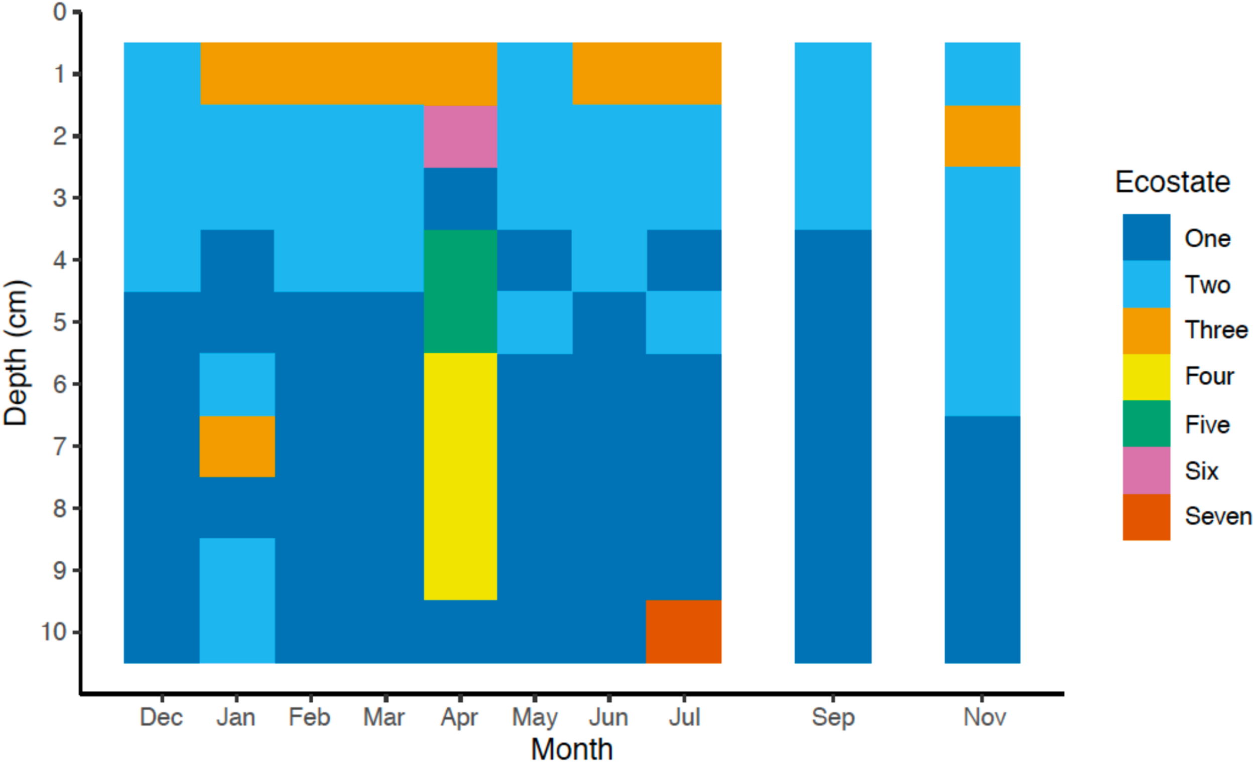 To gain a more holistic understanding of the microbial community dynamics, each discrete spatiotemporal sample (n = 100) was clustered based on the relative abundance of OTUs at 85% 16S rRNA gene identity. The composition of the sedimentary microbial community did not exhibit large fluctuations with the changing seasons in this bioturbated mudflat (Figures 5, 6). Although some individual OTUs exhibit spatial and temporal variability, the community was generally comprised of approximately 20–25 dominant OTUs (Figure 5). Seven main clusters predominated the various communities with respect to time and space (Figure 5). These clusters comprise different “ecostates” that were identified at various depths and times during the season. Ecostates are operationally defined as a collection of inferred taxonomic groups from distinct ecological samples, and they can be used to track changes in ecological communities through space and time (O’Brien et al., 2016). There is a strong depth stratification of ecostates that persists temporally (Figure 6). Ecostate 2 typically dominates all depth intervals <5 cm at all months. We speculate that this ecostate, which has greater abundances of putatively aerobic microbes (Supplementary Table 3), experiences more oxic conditions, partly due to diffusion of O2 from the sediment air/water interface, but primarily driven by biodiffusive transport by animals that create sporadic “oxygen oasis” in these otherwise anoxic sediments (Glud, 2008; Volkenborn et al., 2010). Ecostate 1 was usually confined to deeper sediments >5 cm where lower oxygen conditions would be prevalent (Glud, 2008; Figure 6). The presumed presence of labile organic matter in the upper 5 cm of sediment also likely contributes to the separation of ecostates 1 and 2 as has been observed between other surface and subsurface coastal sediments (Cleary et al., 2017; Qiao et al., 2018). These ecostates are relatively stable throughout the seasons (Figure 6), and appear to be unaffected by observed seasonal changes in environmental conditions and other stochastic events likely occurring in the intertidal zone. More than half of the samples at the sediment-water interface were classified as ecostate 3, which suggests some unique properties of this interface that contributes to the observed community signal (Figures 5, 6). This consistent pattern of stratification was only disrupted once, in the April profile. This profile differed markedly, with three unique ecostates (4, 5, and 6) that were not observed in any other month. These ecostates contained a cluster of high relative abundances of OTUs, described below, that only comprise a minor community component of the other ecostates (Figure 6). The occurrence of unique ecostates in April could reflect a community response to ecosystem disturbance or a stochastic assembly of horizontal spatial heterogeneity, which would both imply resilience of the system.