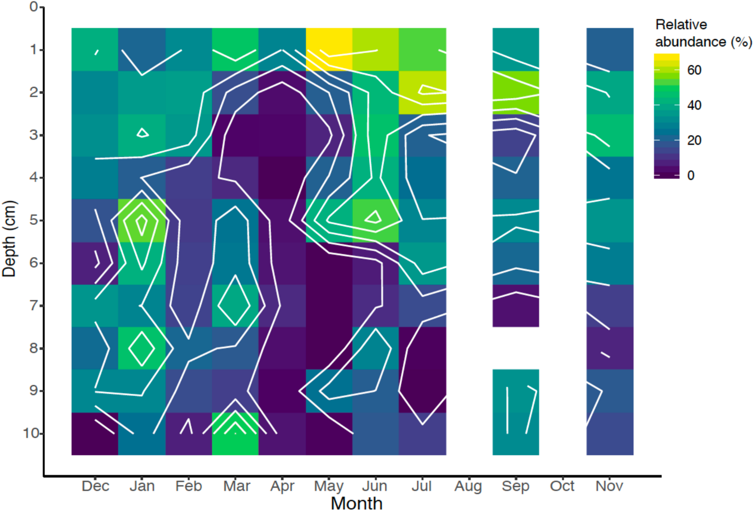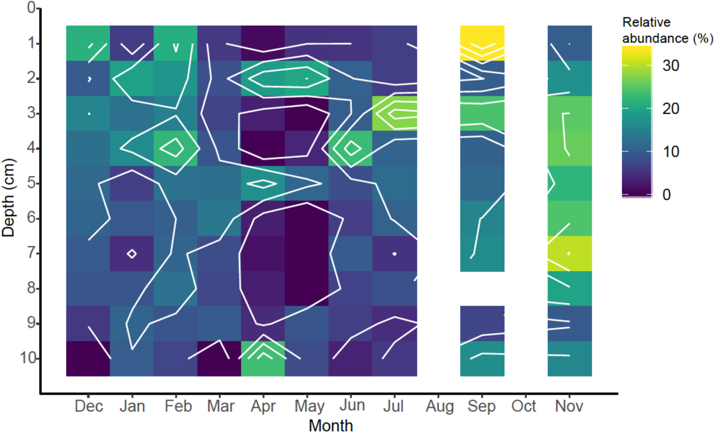 Spatiotemporal relative abundance of nematodes (Nematoda) identified by 18S rRNA gene sequencing over the seasonal cycle.