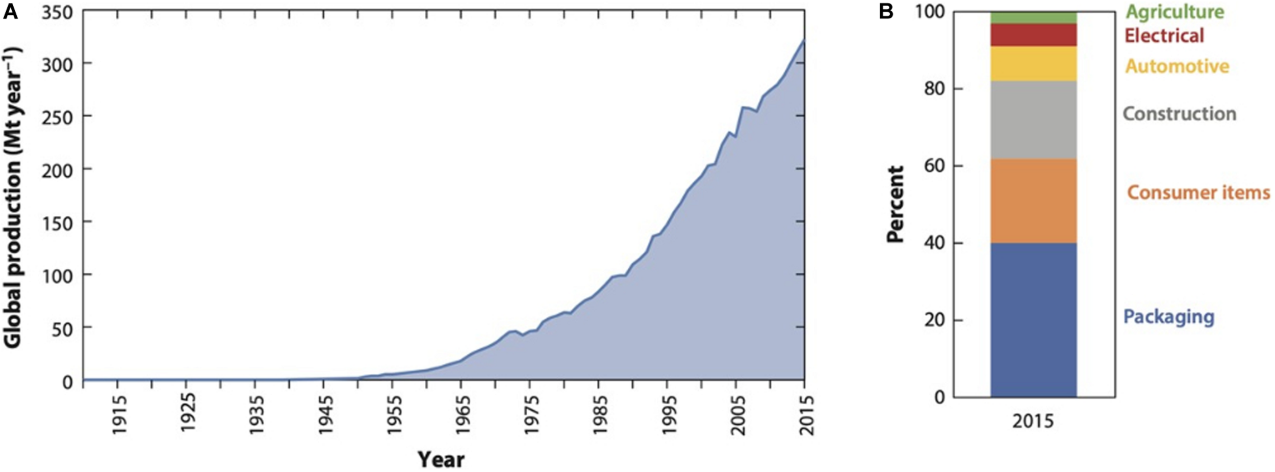 Evolution in total plastic production worldwide. (A) World production in million metric tons per year (Mtâ yearâ1). (B) Plastic utilization distribution of plastic in Worm et al. (2017). Reproduced with permission from the Annual Review of Environment and Resources, Volume 42 © 2017 by Annual Reviews, http://www.annualreviews.org. Copyright 2017, Annual Review of Environment and Resources.