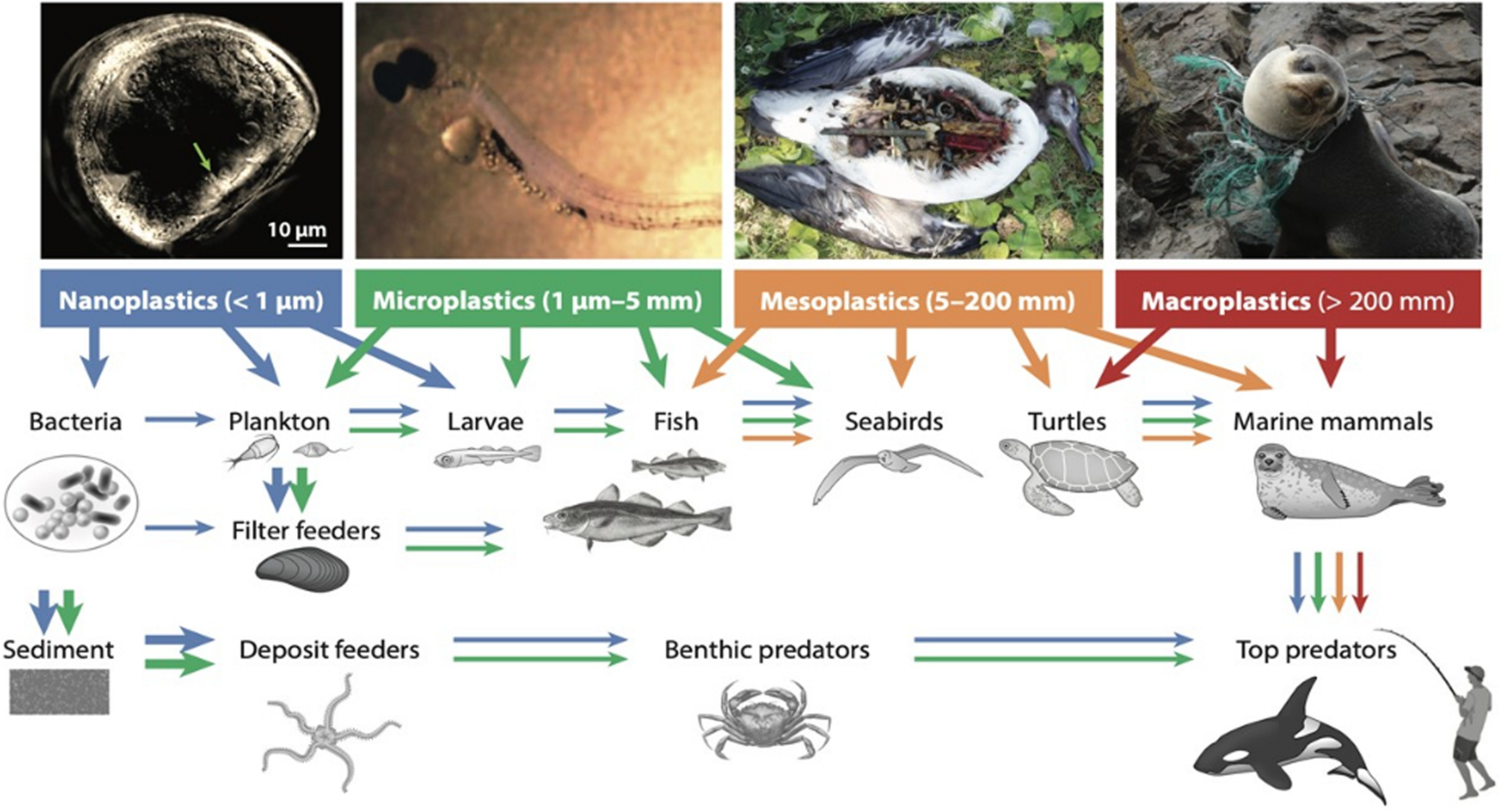 Uptake and trophic transfer of plastic pollution in marine food chain. Plastic debris of different size categories have been shown to affect species directly by ingestion or entanglement (thick arrows) or indirectly via uptake of food sources (thin arrows). Fauna of different sizes and trophic positions will be exposed to particles of s sizes (blue to red) with some degree of bioaccumulation expected, for both particles themselves and associated chemical pollutants. Photographs depict (left to right) nanoplastic particles taken up by oyster larvae, microplastic beads ingested by European perch, dead albatross chick with micro- and mesoplastic debris in the stomach, and sea lion entangled in macroplastic fishing gear (Worm et al., 2017). Reproduced with permission from the Annual Review of Environment and Resources, Volume 42 © 2017 by Annual Reviews, http://www.annualreviews.org. Copyright 2017, Annual Review of Environment and Resources.