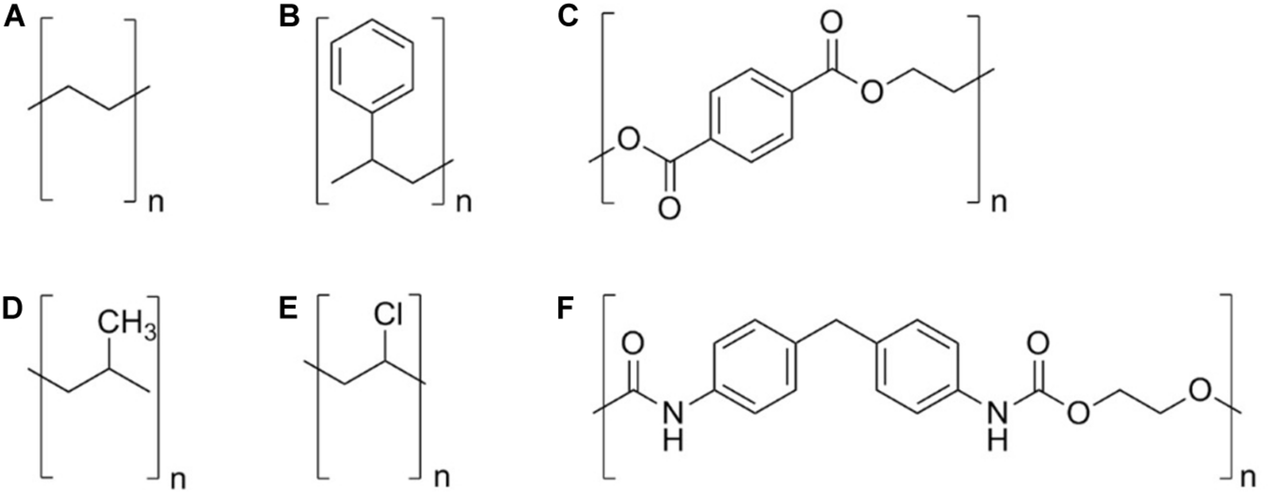 Molecular structure of plastic polymers. (A) Polyethylene, (B) polystyrene, (C) poly(ethylene terephthalate), (D) polypropylene, (E) polyvinyl chloride, and (F) polyurethane.