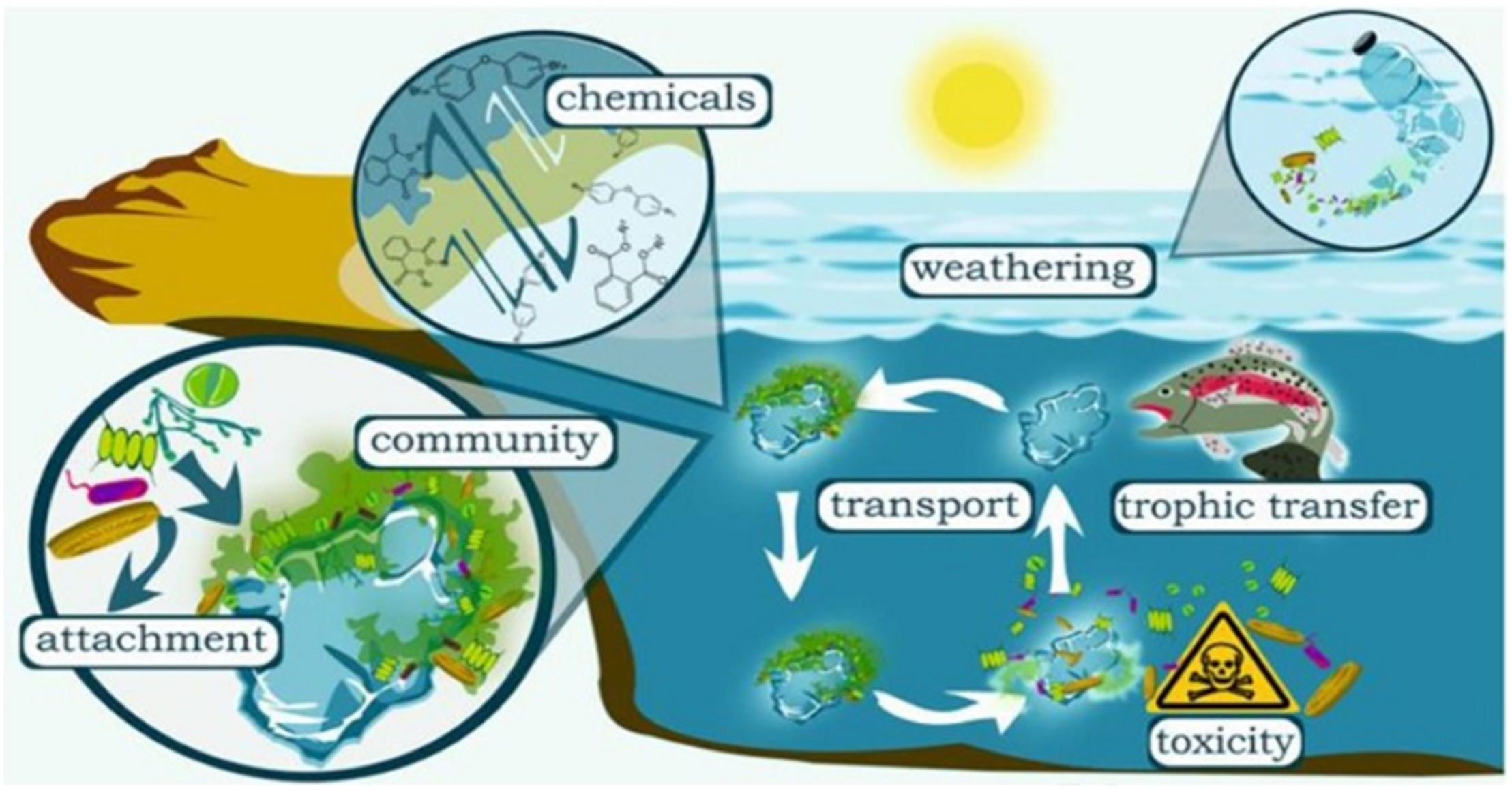 Abiotic and biotic plastic transformation into microplastics and leaching (Rummel et al., 2017). Reproduced with permission from Environmental Science and Technology Letters 2017, 4, 7, 258â267, available at https://pubs.acs.org/doi/10.1021/acs.estlett.7b00164. Copyright 2017, ACS Chemistry for Life.