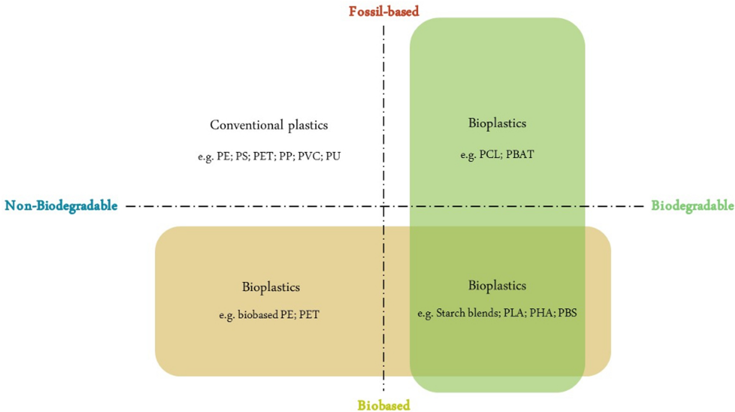 Most currently used polymers, such as plastics, rubbers, and fibers, are synthesized from chemical monomers derived from petroleum, in the presence of a catalyst and an energy source, typically heat. Monomers are processed in the form of a fluid or a solution or emulsion, through two processes: condensation (step growth) and addition/polymerization (chain growth) (Jefferson, 2019). The conventional plastics that dominate the world market are polypropylene (PP) 21.1%, polyethylene (PE): low-density polyethylene (LDPE) 19.9%, high-density polyethylene (HDPE) 16.1%, polyvinyl chloride (PVC) 11.8%, polyethylene terephthalate (PET) 10.2%, polyurethane (PU) 8.4%, and polystyrene (PS) 7.8% (Geyer et al., 2017). The abovementioned plastic types have different applications; for example, PE is usually used in packaging products that have a short shelf life, like plastic bags, bottles, cups, and storage containers. PS is usually used in utensils, tableware, cafeteria trays, and containers. PET is typically used in bottles and cups. PP is used in auto parts, food containers, and industrial fibers. PVC is commonly used in building construction, as it has much longer lifetime. PU is used in medical devices, packaging, coating, and building construction (Tokiwa et al., 2009; GESAMP, 2015). Table 1 summarizes the main applications of the most used abovementioned plastics.
