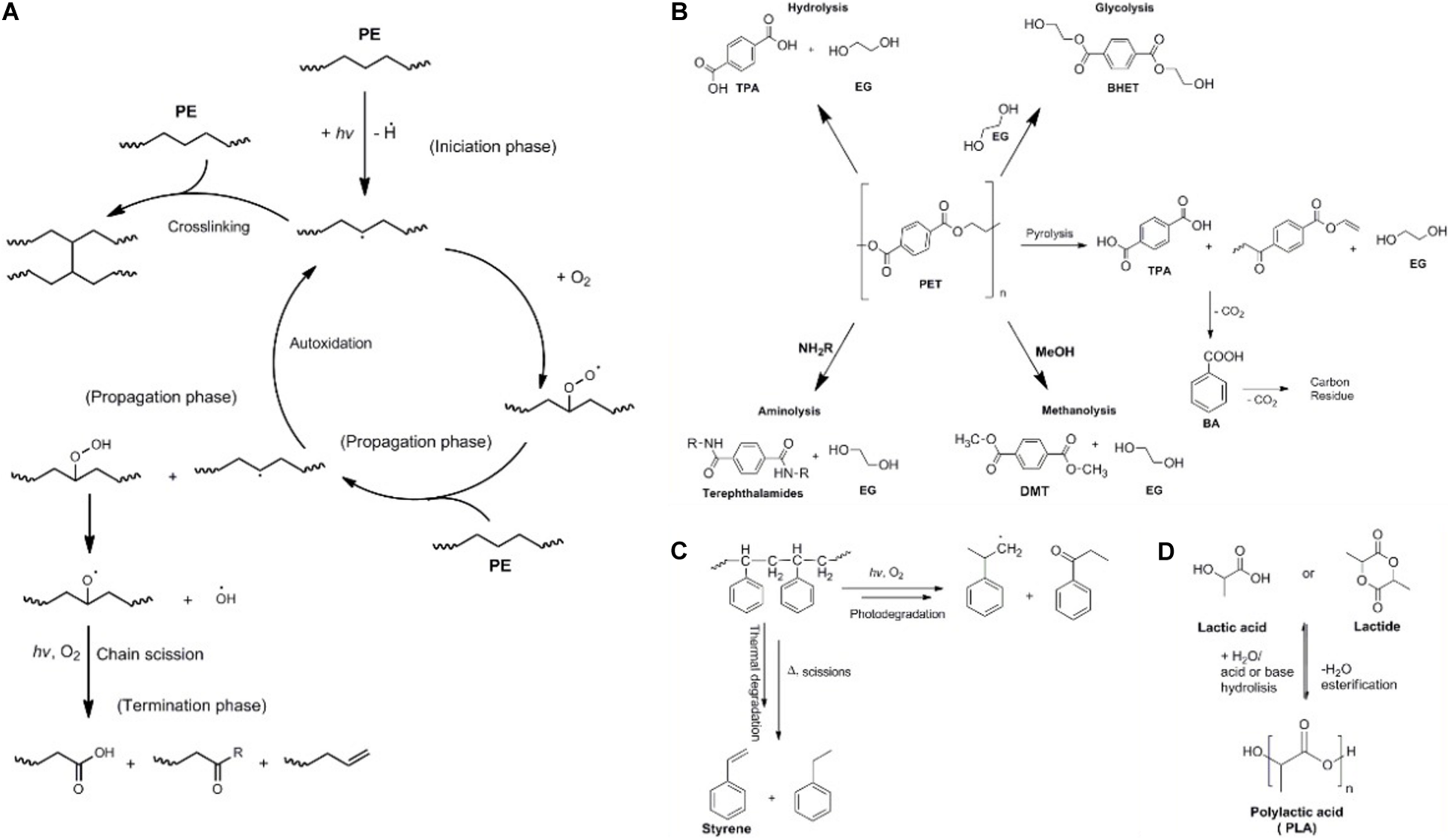 Poly(ethylene terephthalate) is formed through polycondensation of terephthalic acid (TPA) and ethylene glycol (EG) or by transesterification of dimethyl terephthalate and EG (Figure 4C; Hiraga et al., 2019). Poly(ethylene terephthalate) is a crystalline polyester, colorless, and chemically stable, often used in the manufacture of food and drink containers and packaging, as well as in electronic components. PET has high resistance to heat, alcohols, and solvents and, when oriented, has very high mechanical resistance, such as to wear and tear. It also represents a medium barrier to oxygen. Its melting point occurs at high temperature, 260°C, making it suitable for high-temperature applications such as steam sterilization and microwave cooking (Crawford and Quinn, 2017; Raheem et al., 2019).