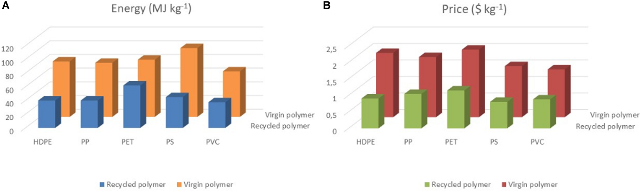 Thermoplastics are very high molecular weight polymers, rigid or flexible at room temperature, but soft and elastic at high temperatures. Thus, they can be molded plastically as many times as necessary, returning to the solid state after cooling. As this process can be repeated several times, these plastics are recyclable and can be reused. The recycled thermoplastic cannot be used in food packaging to avoid contamination from paints and toxic products and can return in the form of buckets, hoses, garbage bags, and other modalities. This category includes the main six families of plastics: low-density polyethylene (LDPE), high-density polyethylene (HDPE), polypropylene (PP), polystyrene (PS), polyethylene terephthalate (PET), and polyvinyl chloride (PVC).