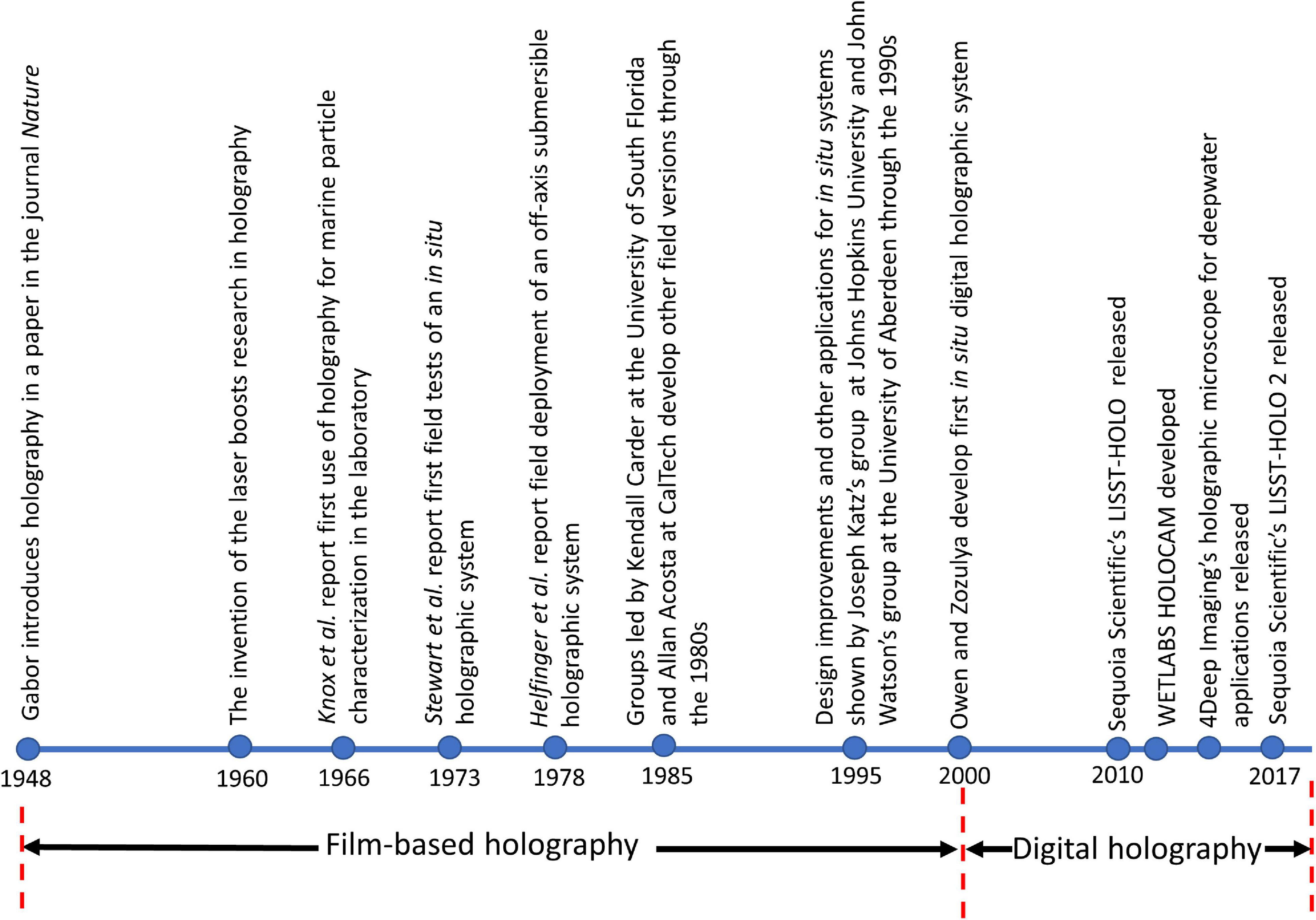 A timeline of the historical developments in holography in the context of in situ aquatic applications.