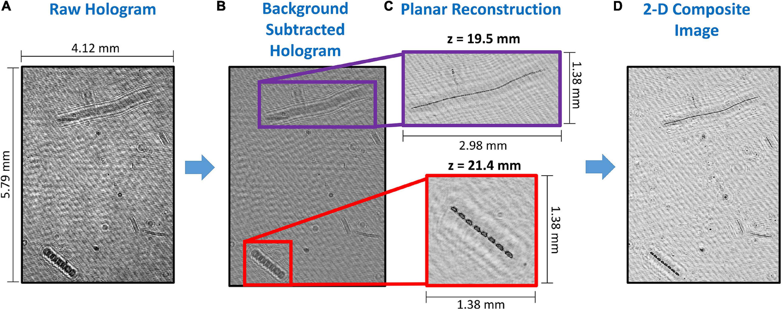 An illustrative example showing the different steps in holographic data processing: (A) A sample raw unprocessed hologram; (B) The same image after background subtraction, with regions of interest highlighted, and showing only interference patterns; (C) The in-focus diatom chains at different reconstruction depths (z) within the sample volume in the highlighted region; and (D) The 2-D composite image, where all in-focus particles are collapsed onto the same plane for further analysis.