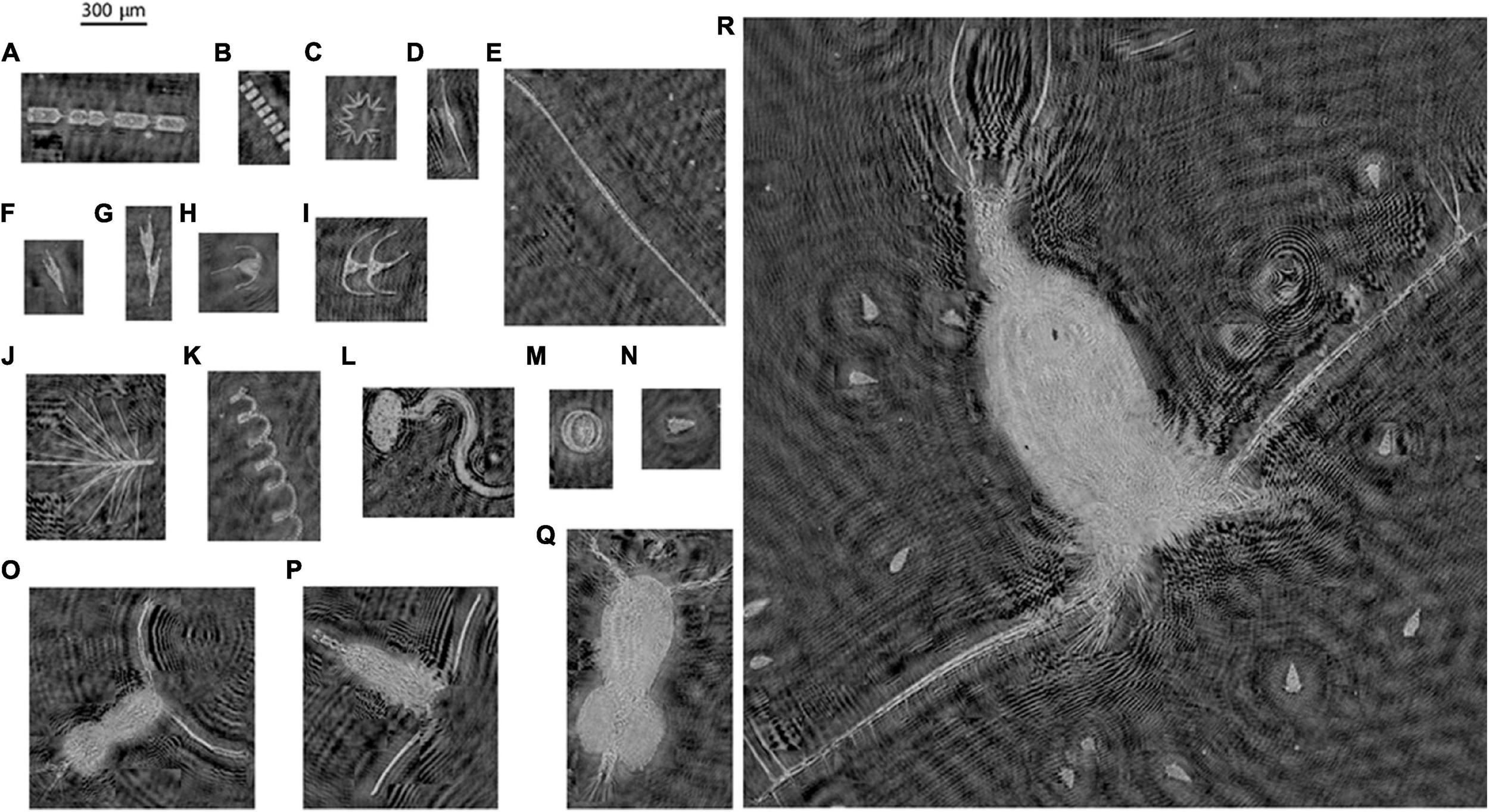 A collage of different plankton recorded from diverse environments on field cruises in the Atlantic Ocean (Delaware shelf), the Gulf of Mexico and East Sound, Washington, a coastal fjord in the Pacific Northwest. (A)Ditylum brightwelli; (B)Thalassiosira sp.; (C)Thalassionema sp.; (D)Tripos cf. fusus; (E) Unidentified colony; (F)Tripos cf. furca; (G)Tripos cf. furca, dividing cell; (H)Tripos muelleri; (I)Tripos sp. dividing; (J)Chaetoceros sp.; (K)Chaetoceros cf. debilis; (L) Appendicularian; (M)Coscinodiscus sp.; (N) cf. Strombidium sp.; (O) Calanoid copepod with egg sac; (P) Calanoid copepod; (Q) Cyclopoid copepod with paired egg sacs; and (R) Unidentified large copepod, potentially feeding on cf. Strombidium sp.
