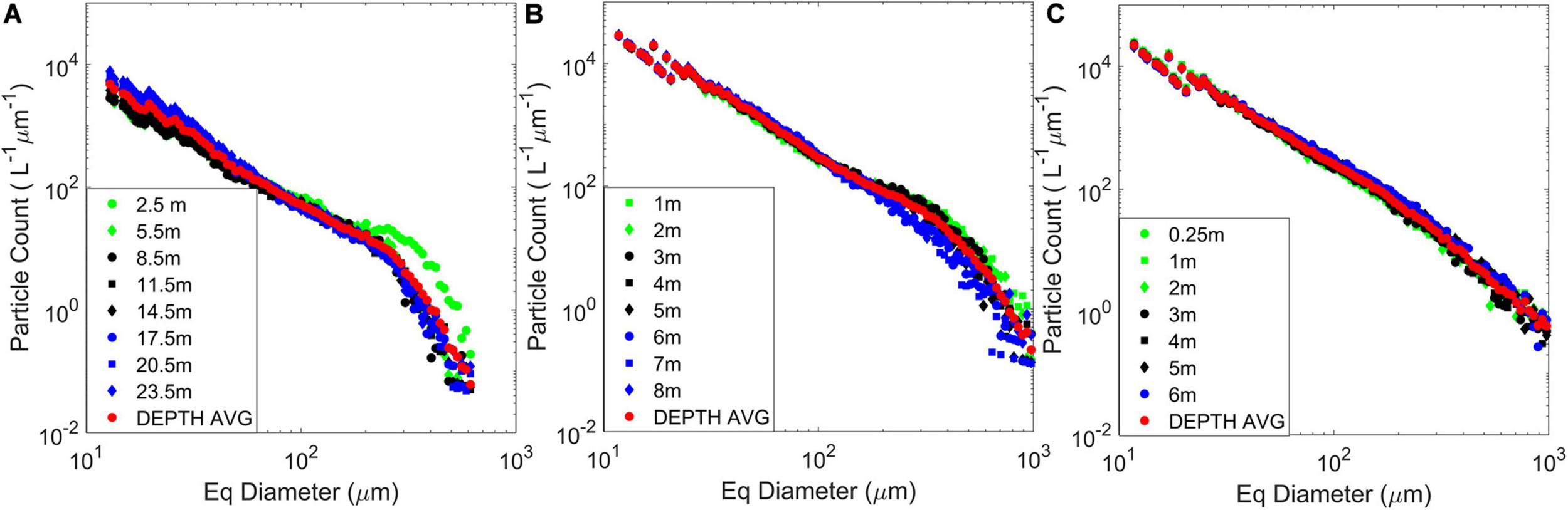 Depth-binned and depth-averaged particle size distributions (PSDs) obtained from vertical profiles of a holographic imaging system during two field experiments at East Sound, Washington, in September 2015 and at Lake Erie in August 2014. Figure adapted from data presented in Moore et al. (2017) and Nayak et al. (2018a; 2018b). (A) The East Sound profile was recorded during the presence of a “thin layer” of diatoms, dominated by Ditylum brightwelli; (B) Data recorded during a Microcystis aeruginosa bloom in western Lake Erie; and (C) PSDs at Lake Erie in a water mass dominated by the cyanobacteria Planktothrix aghardii.