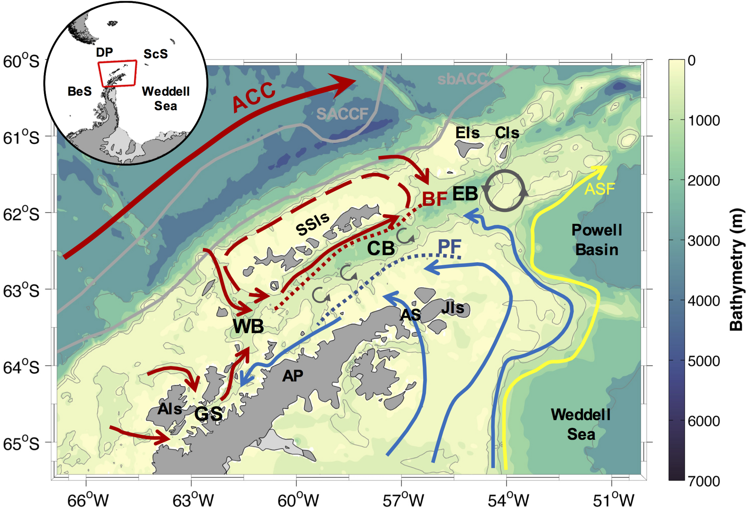Schematic of the ocean circulation patterns and mesoscale features in the Northern Antarctic Peninsula (NAP), following Smith et al. (1999); Garcia et al. (2002), Zhou et al. (2002); Savidge and Amft (2009), and Sangrà et al. (2017). The red arrows depict intrusion of warm waters, whereas the blue arrows depict the cold regime by Weddell Sea shelf waters advection into the NAP. The blue and red dotted lines show the surface Peninsula Front (PF) and the subsurface Bransfield Front (BF), respectively. The red dashed arrow depicts the recirculation around the South Shetland Islands (SSIs). The yellow arrow represents the location of the Antarctic Slope Front (ASF) and the flow associated to the Antarctic Slope Current, following Heywood et al. (2004). A stationary anticyclonic eddy south of Clarence Island (CIs), and the submesoscale eddies along the Bransfield Strait, are shown by dark gray arrows. The inset shows the location of the NAP, and the main areas surrounding the study region. Antarctic Circumpolar Current (ACC), Antarctic Peninsula (AP), Antarctic Sound (AS), Bellingshausen Sea (BeS), Drake Passage (DP), Scotia Sea (ScS), Anvers Island (AIs), Gerlache Strait (GS), Western basin (WB), Central basin (CB), Eastern basin (EB), Joinville Island (JIs), Elephant Island (EIs). The gray lines depict the Southern ACC Front (SACCF) and the southern boundary of the ACC (sbACC) following Orsi et al. (1995).