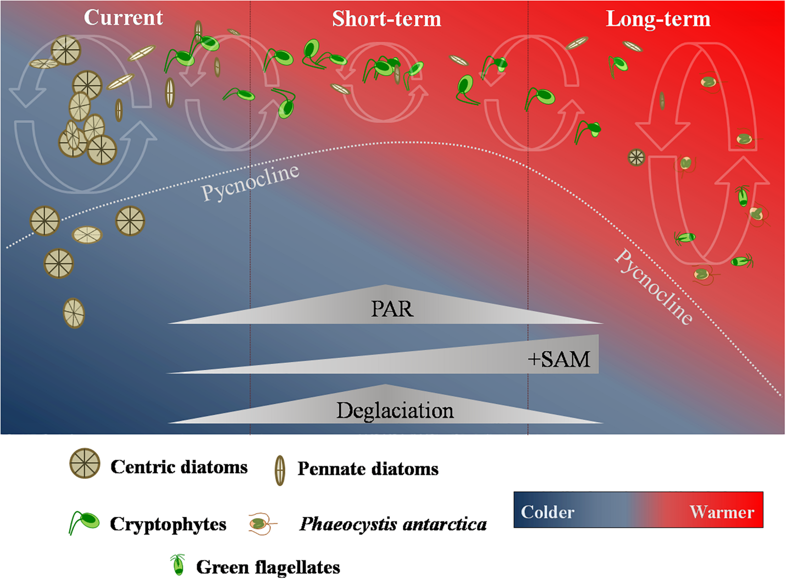 Anthropogenic greenhouse gas emission are predicted to continue to climb over the years (Santoso et al., 2017). Models also predict that the positive SAM frequency will increase for the next 50 years, contributing to persistent strong westerly winds and rising temperatures along the NAP. This will result in further glacial retreat and sea ice decline (Gillett and Fyfe, 2013; Turner et al., 2014). Due to increasing processes of deglaciation, in short-term, it is believed that the MLD will become shallower, leading to a strengthening of the already described increase in the integrated daily irradiance available to phytoplankton in surface waters (Marinov et al., 2010; Petrou et al., 2016). Thus, phytoplankton cells are expected to be more exposed to light stress in the upper shallower layers, which would present a fundamental niche favorable to the development of cryptophytes (Mendes et al., 2013, 2018a,b; Figure 2) and potentially lead to an increase in the overall abundance of these nanoflagellates.