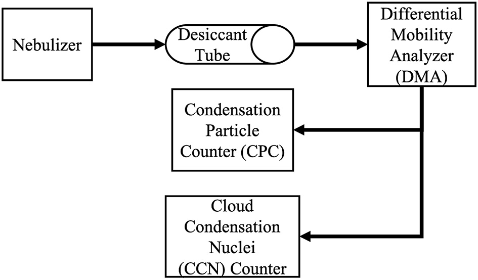 The setup for CCN measurements in the NASA LaRC laboratory is shown in Figure 2. A custom built nebulizer was used to create aerosols from the SML and DSML samples. While the nebulizer generated particles, the CCN measurements in this study were not sensitive to the total mass of material, only to the relative concentrations of the mass of solutes in the aerosolized solutions. The aerosols were then passed through a desiccant drier to a differential mobility analyzer (DMA, TSI Inc. Model 3082) for size selection. The size range was set to measure aerosol sizes from 10 to 520 nm. Exiting the DMA, the flow of aerosols was split between a condensation particle counter (CPC, TSI Inc. Model 3776) and a cloud condensation nuclei counter (CCN counter, Droplet Measurement Technologies, Inc. CCNC-100). The use of the nebulizer in this study may have reduced the organic fraction in the aerosol to some degree. Other studies have reported that using the water fall method produces aerosols with more realistic marine aerosol compositions than other generation methods (Fuentes et al., 2010; Prather et al., 2013; Stokes et al., 2013; Collins et al., 2014; Lee et al., 2015; McCluskey et al., 2017; Christiansen et al., 2019).