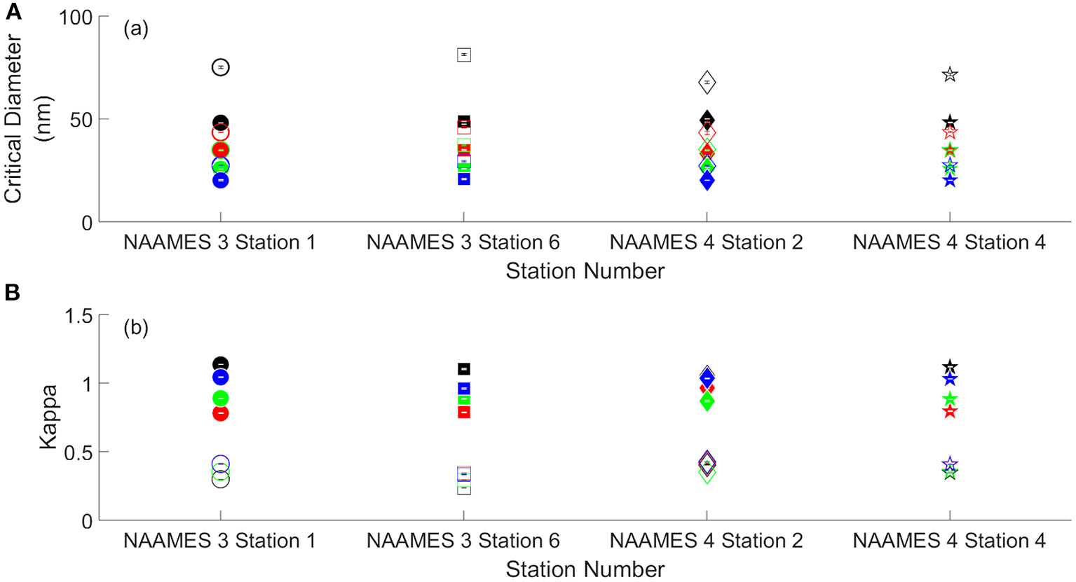 The critical diameter of an aerosol is defined as the diameter an aerosol must reach for spontaneous uptake of water and cloud droplet formation to ensue. Operationally, the critical diameter was determined by plotting activated fraction against dry diameter and determining the diameter at which 50% of the particles activated as CCN (Rose et al., 2008; Ma et al., 2013). The critical supersaturation, defined as the supersaturation when the critical diameter is achieved and spontaneous growth occurs, was also determined. An example of an activated fraction vs. diameter plot is provided in Supplementary Figure 1.