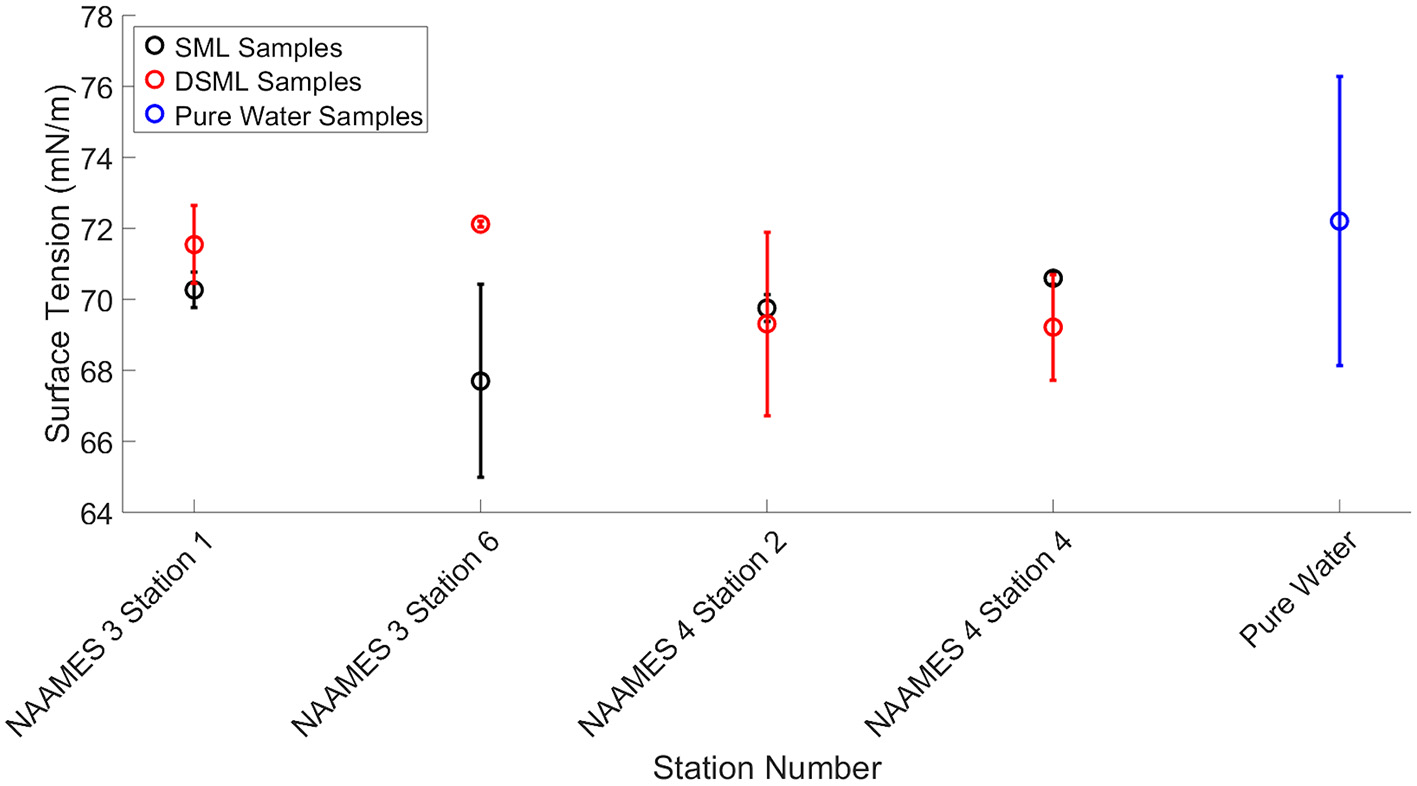 The surface tension was measured for each SML and DSML sample using a pendant drop tensiometer (Biolin Scientific Model Attension Theta). The measured surface tension values of the SML and DSML samples were used in the predictions of the hygroscopicity parameter, κ, as discussed below. In CCN calculations, the surface tension is often assumed to be that of pure water (Ovadnevaite et al., 2017; Bzdek et al., 2020; Lin et al., 2020). However, that assumption may be inaccurate in the case of marine samples because surface active microgels, carbohydrates, proteins, and lipids can reduce surface tension and allow CCN to activate at lower supersaturations (Moore et al., 2008; Brooks and Thornton, 2018; Jenkinson et al., 2018). It has been suggested that for the surface tension of aerosols composed purely of surfactants to reach its equilibrium requires significant time (as much as 100 s or more) (Noziere et al., 2014). Fortunately, the inclusion of salts, such as in marine aerosol, reduces the equilibrium time. Therefore, in the present study, the surface tension and CCN measurements may have had sufficient time to each equilibrium, after all. Nevertheless, this should be addressed in future research.