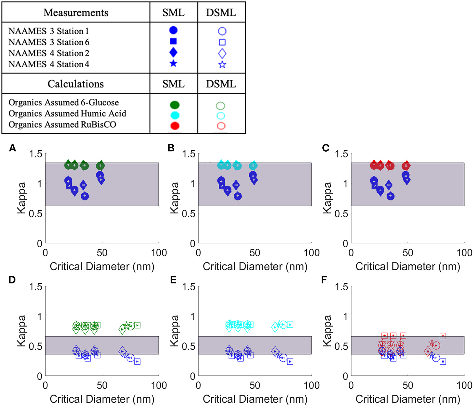 The SML predicted κ values were calculated using the quantity of salts (from ion chromatography) and measured DOC concentrations. According to the ion chromatography, the DSML salt concentration was reduced by >99% from the desalting process. For the predicted κ values for the DSML samples, the organic concentrations were assumed to be the same as the concentrations in the SML samples. Measured DOC concentrations were converted from to based on the molecular formula of the representative organic species.