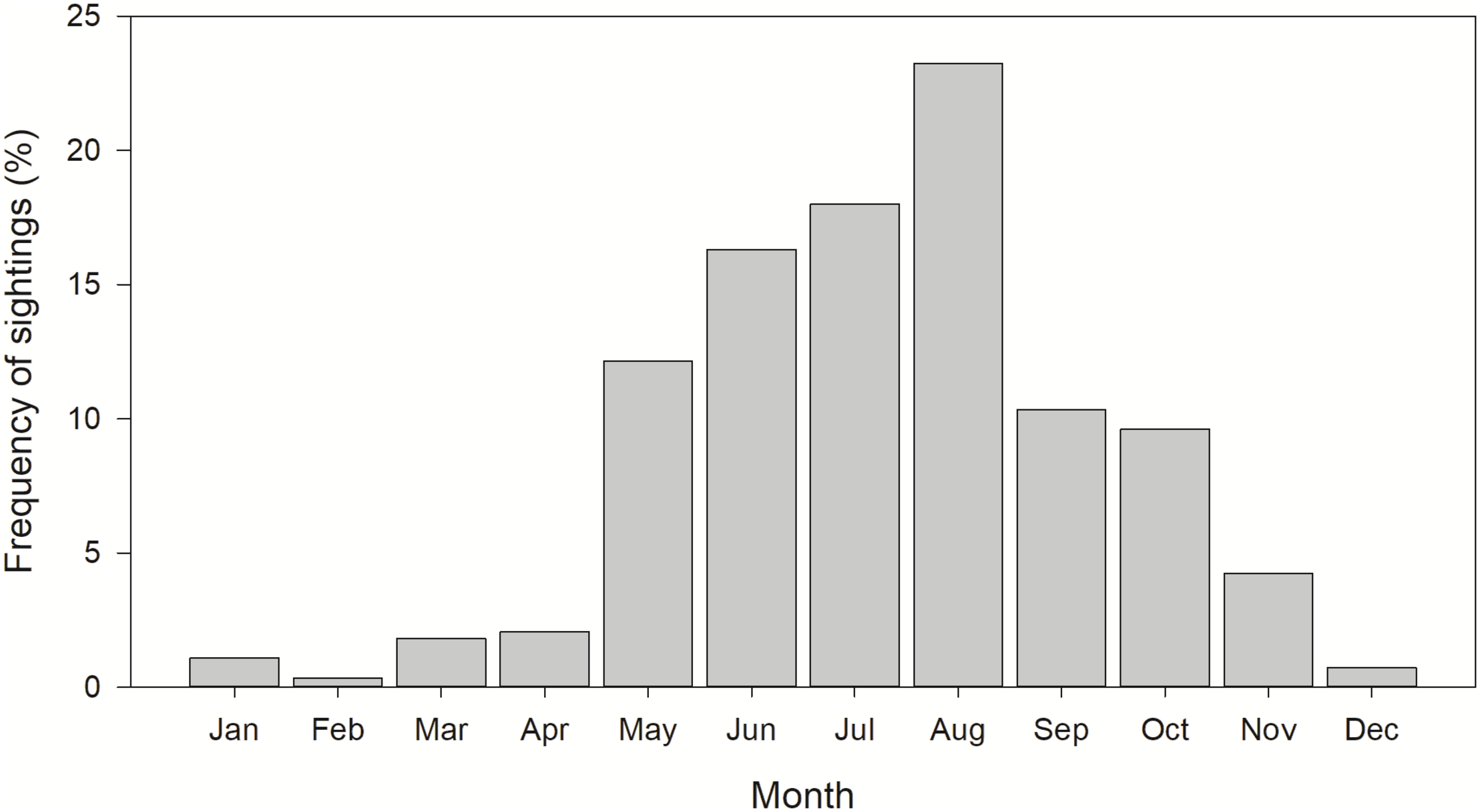 Monthly distribution of whale shark, Rhincodon typus, sightings reported in the northern Gulf of Mexico from 1989 to 2016. n = 822.