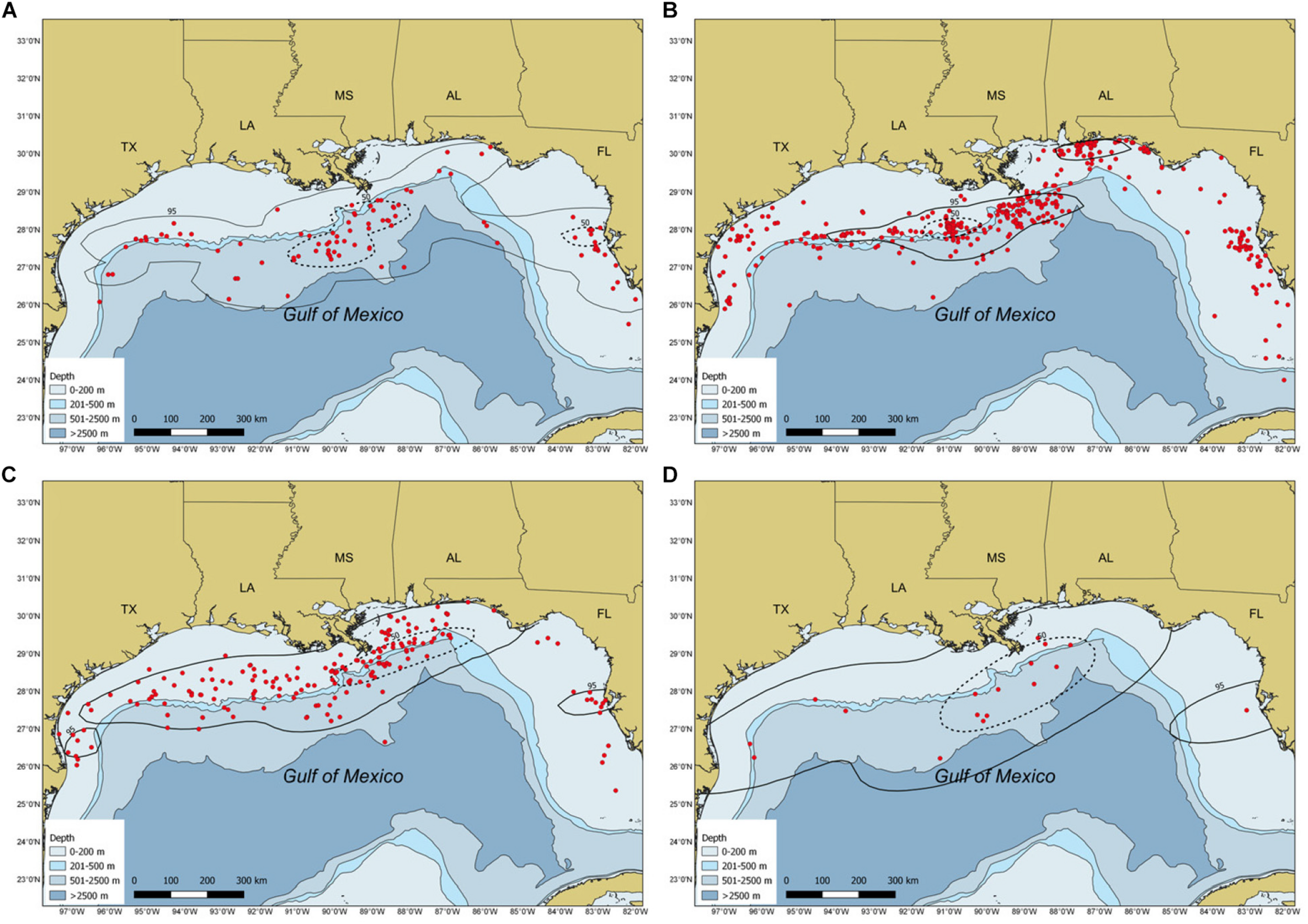 Maps depicting sighting locations (red circles) and weighed kernel utilization distributions of whale sharks, Rhincodon typus, in the Gulf of Mexico by season: (A) spring, (B) summer, (C) fall, and (D) winter from 1989 to 2016. The 95% (solid black line) and 50% (dashed black line) contours are presented. Circles represent both individual and aggregation sightings.