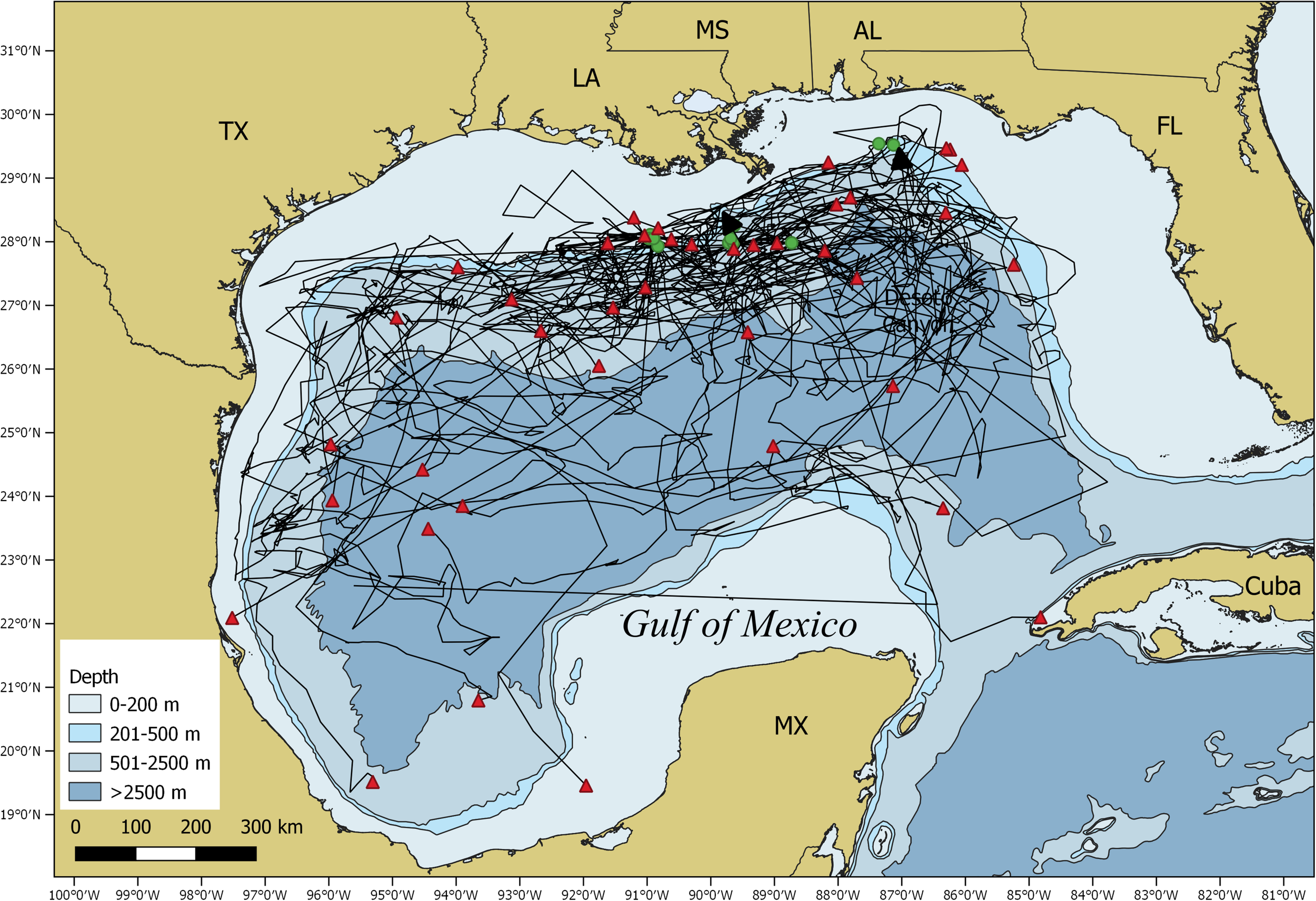 Map of the Gulf of Mexico showing satellite tag based movement trajectories (black lines) of all individual tagged whale sharks, Rhincodon typus, along with the tagging (green circles) and popup (red triangles) locations.