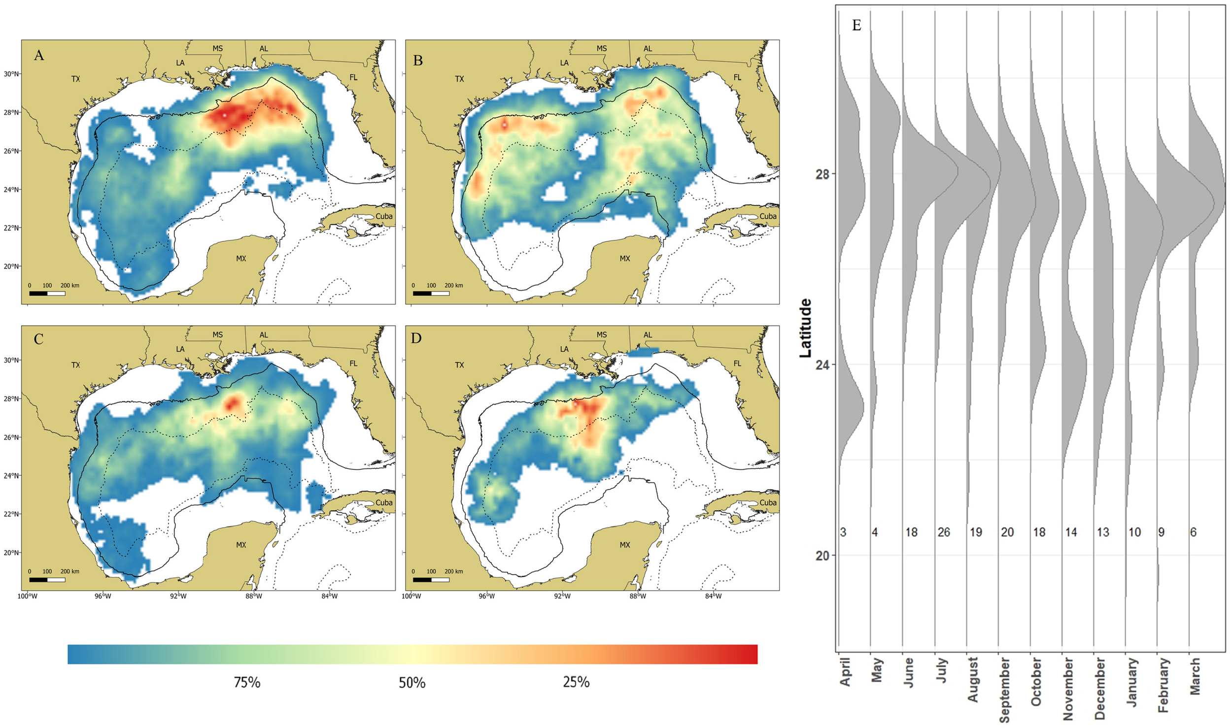 Maps depicting residency distributions of whale sharks, Rhincodon typus, based on most probable track locations in the Gulf of Mexico by season; (A) summer, (B) fall, (C) winter, and (D) spring. The black solid line represents the 200m isobaths and the black dashed line represents the 2,500 isobath, separating the continental shelf, slope, and open ocean water of the Gulf of Mexico. The latitudinal density plot (E) shows the latitudinal distribution of PSAT tagged whale sharks in the northern Gulf of Mexico from 2008–2014. Each vertical line represents a month of the year and the numbers to the right of each line indicate the number of individuals tracked during that month.