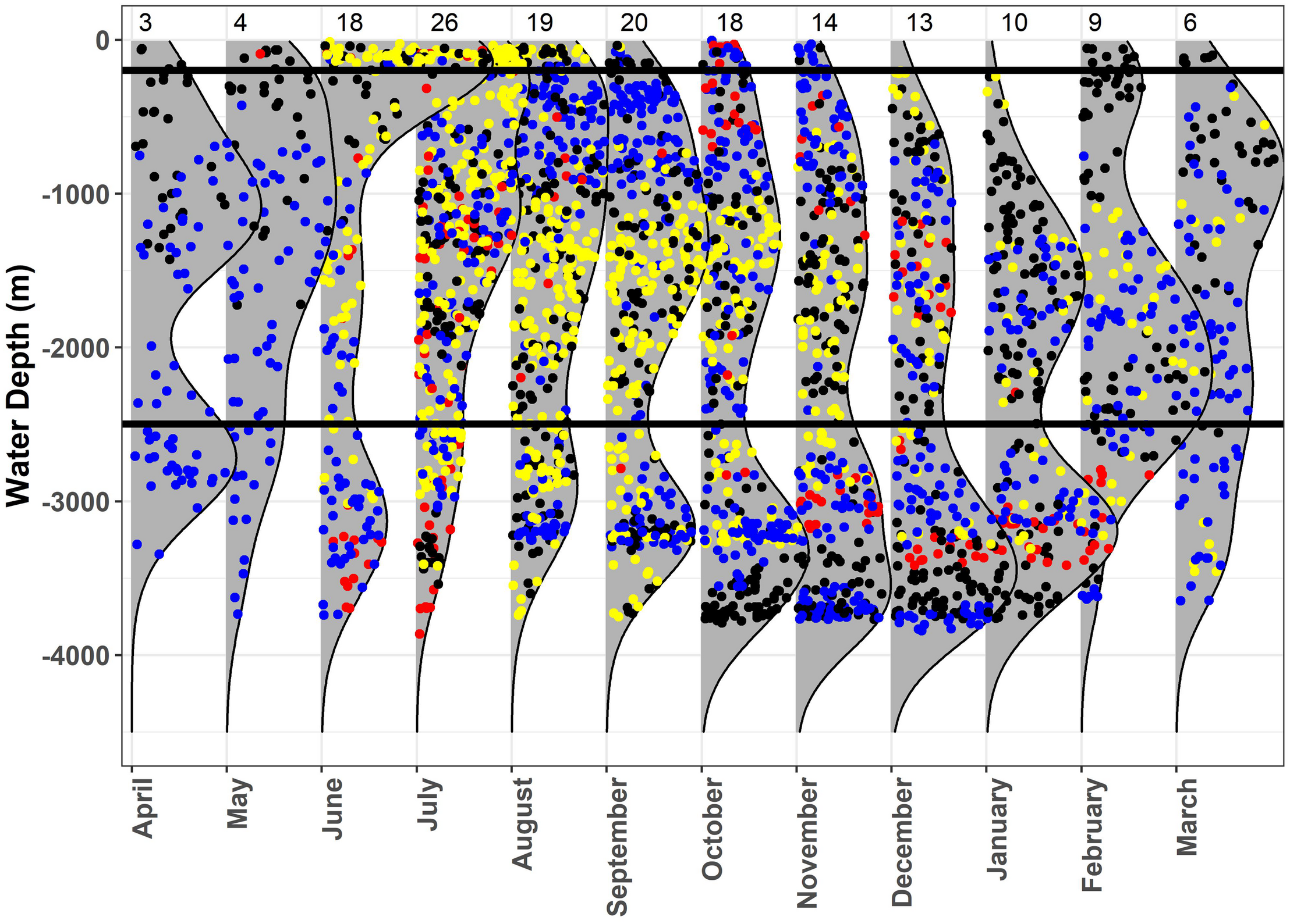 Monthly kernel density plots of water depth at the most probable location estimates for whale sharks, Rhincodon typus, in the Gulf of Mexico. Immature males (yellow), adult males (blue), and females (red) are represented. The black horizontal lines designate the separation between the three regions: shelf (0–200 m), slope (200–2500 m), and open ocean (>2500 m). Sample size of tagged sharks is shown at the top of the plot for each month.
