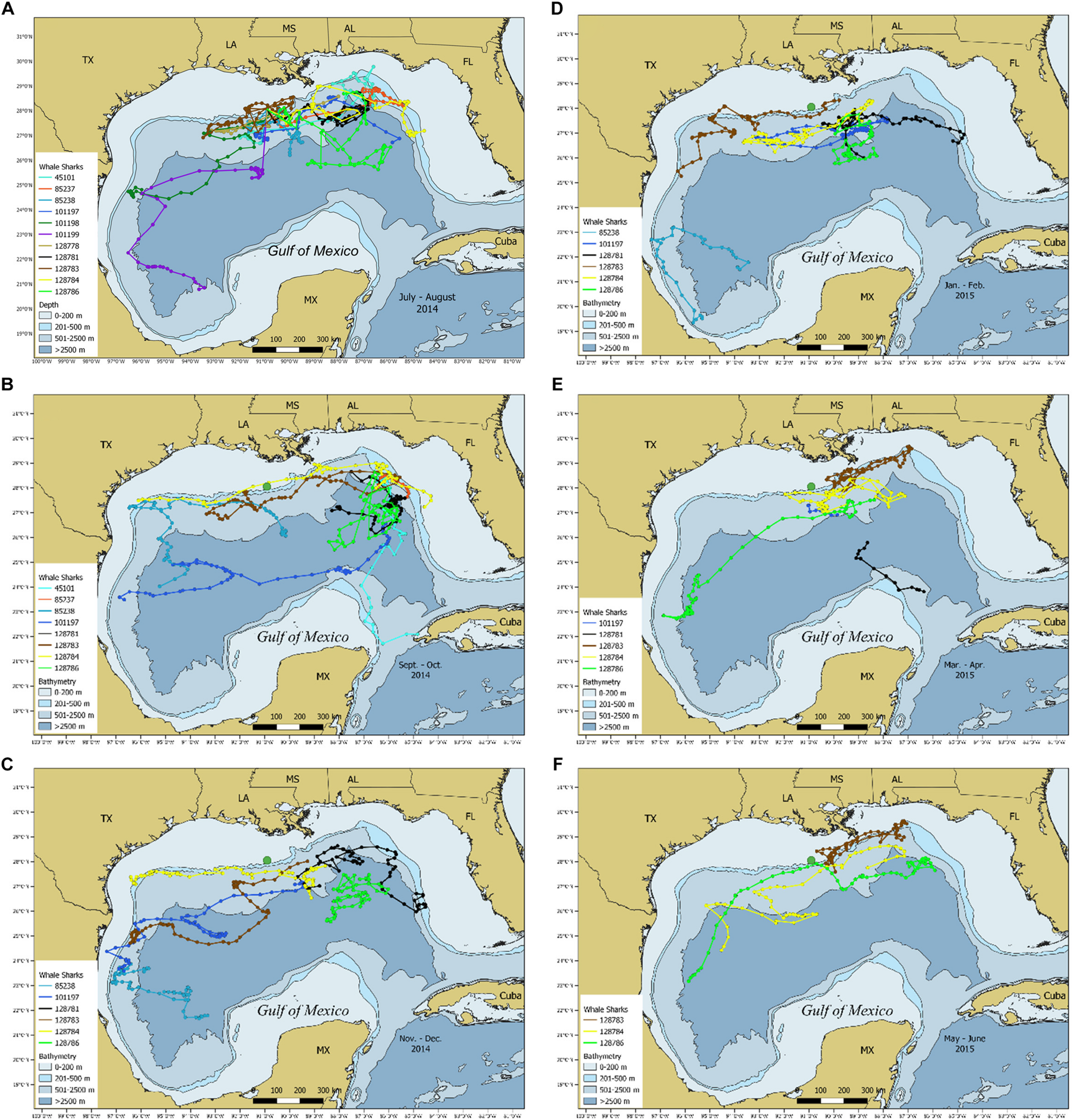 Maps depicting temporal changes in the most probable tracks for whale sharks, Rhincodon typus, tagged on 10 July 2014. Tracks range from (A) July–August 2014, (B) September–October 2014, (C) November–December 2015, (D) January–February 2015, (E) March–April 2015, and (F) May–June 2015. Large green circle indicates tagging location of Ewing Bank.